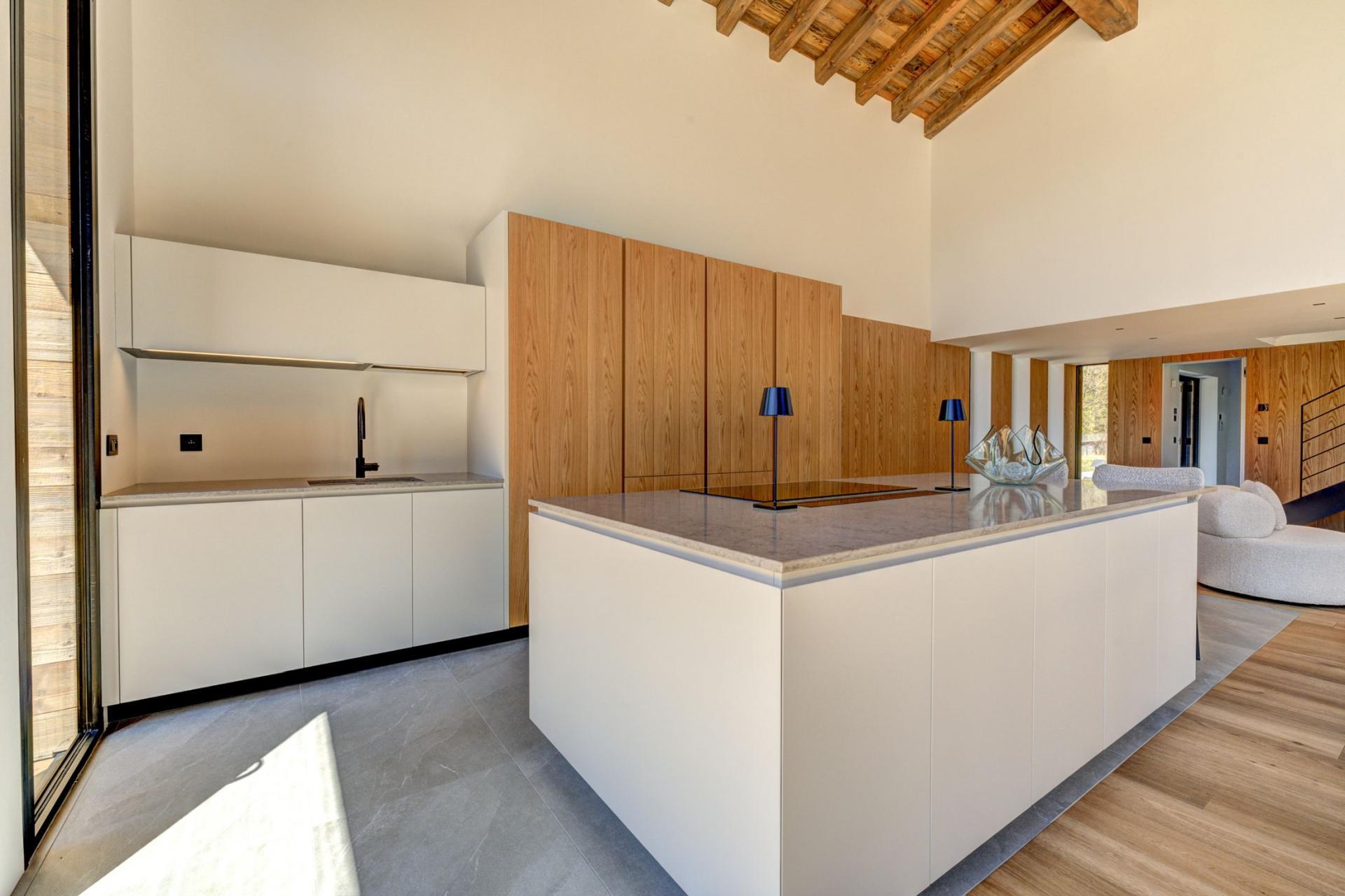 The chalet flaunts an impressively spacious, open-plan living area consisting of a cosy lounge, dining table, and a minimal, fully fitted kitchen. Floor-to-ceiling windows bring in ample amounts of natural light to highlight the contemporary, neutral decor, as well as framing views of the Mont Blanc and Aiguille du Midi mountains. Double-height, vaulted ceilings also add to the sense of space in this incredible room. Designed for entertaining, the floor's layout is made for unwinding with the whole group, whether it's relaxing on the plush sofas after a day exploring the Chamonix valley, evening banquets around the table or social cooking preparations.