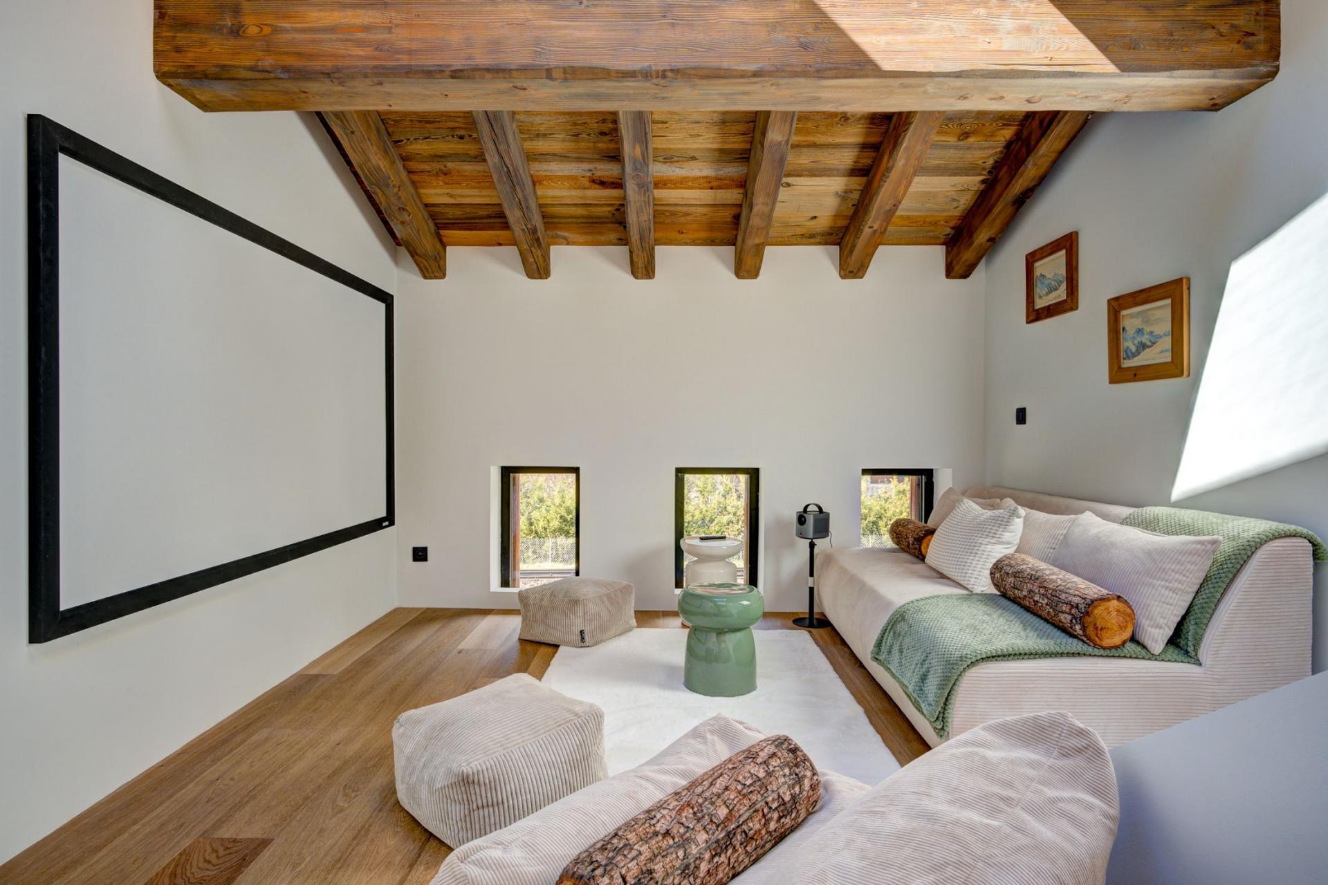 Inside, Chalet Fortuna offers further spots to unwind. A TV lounge on the mezzanine floor, fitted with comfy beanbags and a sofa, presents a quiet nook to retreat to and enjoy a favourite film or some downtime reading. The opposite side of this mezzanine space also presents an area for guests who enjoy yoga, perfect for beginning each morning. For those needing space to work, a desk space is available to send any last-minute emails before making the most of the remainder of your luxury summer holiday in Chamonix.