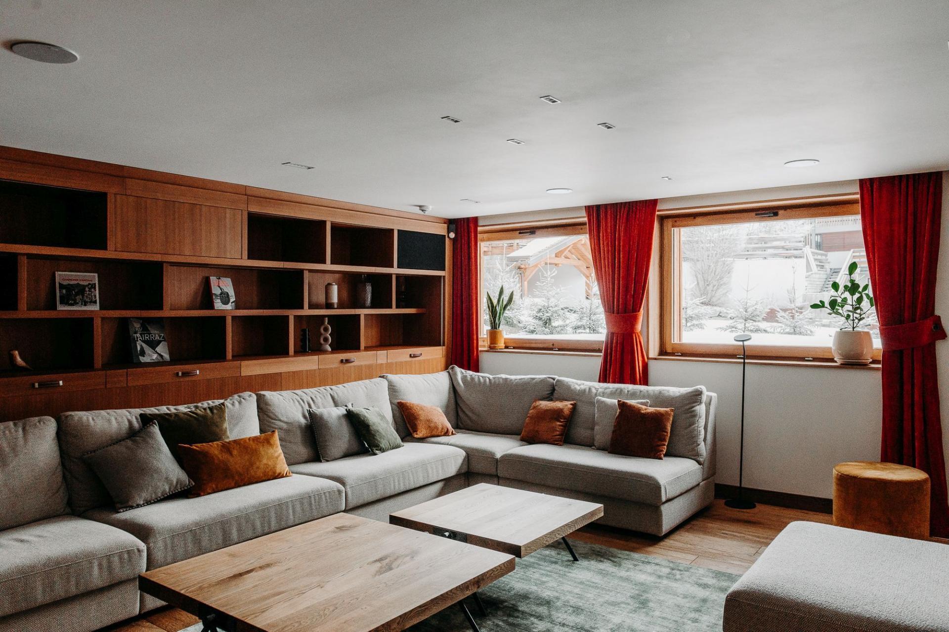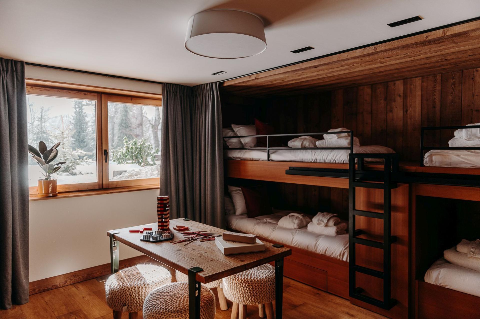 Each bedroom has been thoughtfully designed to reflect the lodge's refined mountain style. In total, Granite Mountain Estate accommodates for up to 20 guests across 8 bedrooms. Spacious and serene, rooms are clad in soft wooden finishes and furnished with cosy touches. Flexibility is built in - four double rooms can convert to twins, while another bedroom can be arranged either as a double or a children's bunk room, sleeping up to four. The 80m² connecting annexe apartment offers even more space and privacy, making it perfect for extended families or multiple families travelling together, with 2 double/twin bedrooms alongside an additional sofa bed on the mezzanine floor.
