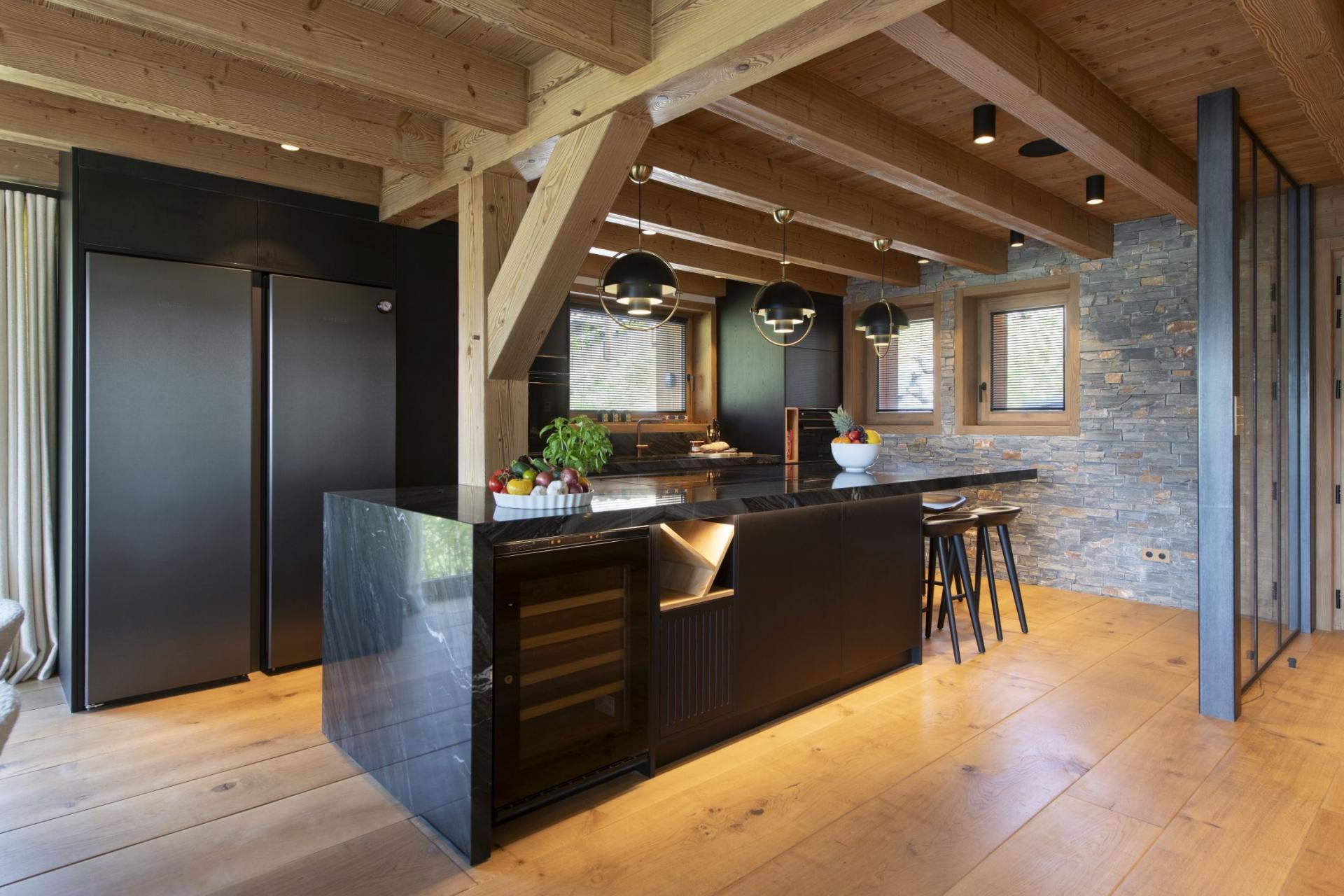 Filled with natural light from the large windows throughout, the interiors at Chalet Avalon offer beautiful light furnishings and smooth wooden designs. Make yourself comfortable on the stylish furniture that provides guests with the perfect spot to sit back and enjoy a few social drinks with the stunning views ahead. On the other side of a central fireplace lies the kitchen-dining area, which has a slightly different modern tone with dark textures that give the living areas a wonderful contrast. Dine on the spacious table or have a casual snack at the sociable breakfast bar. At Chalet Avalon, the choice is yours! Later in the day, be sure to treat yourselves to a drink at the bar.