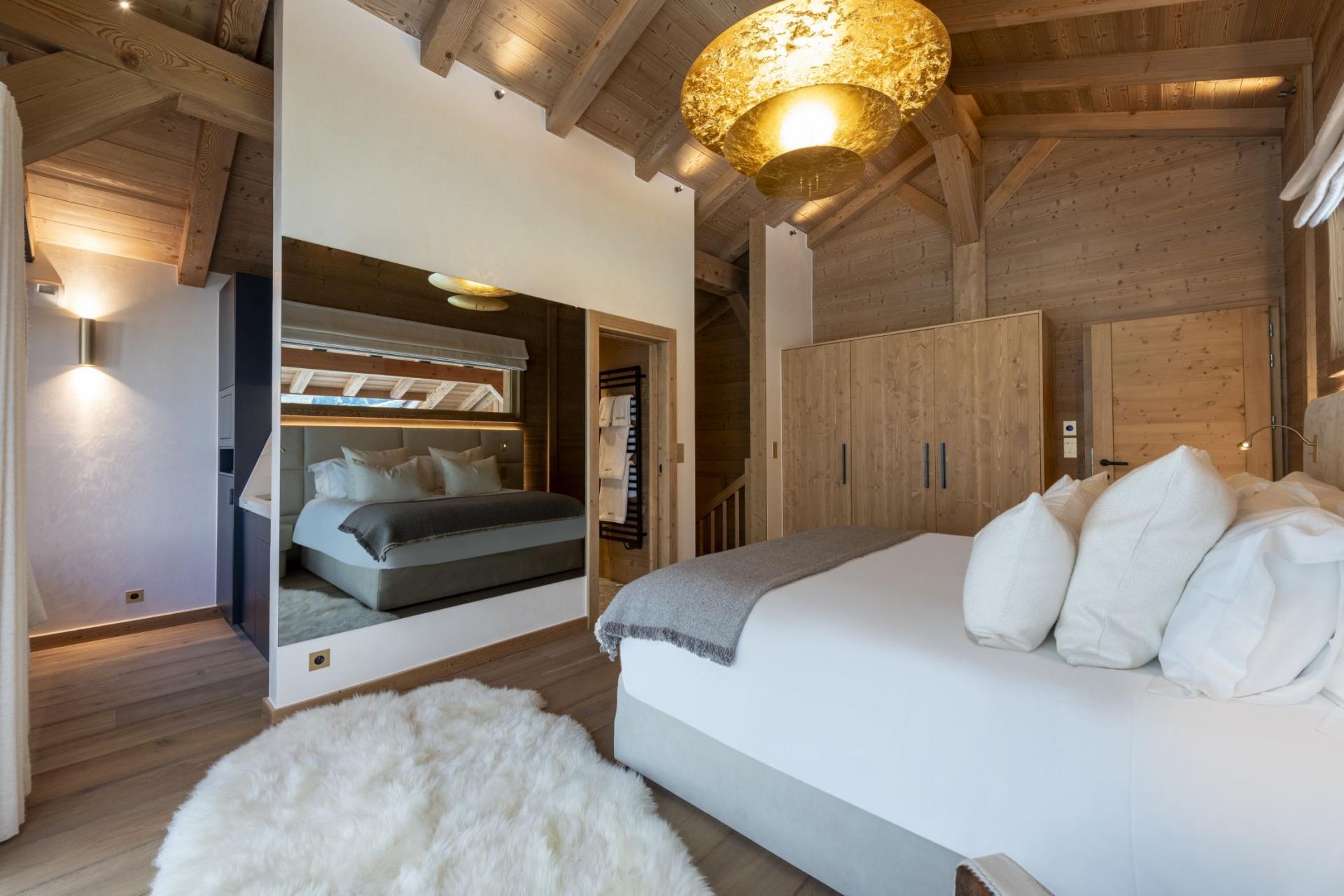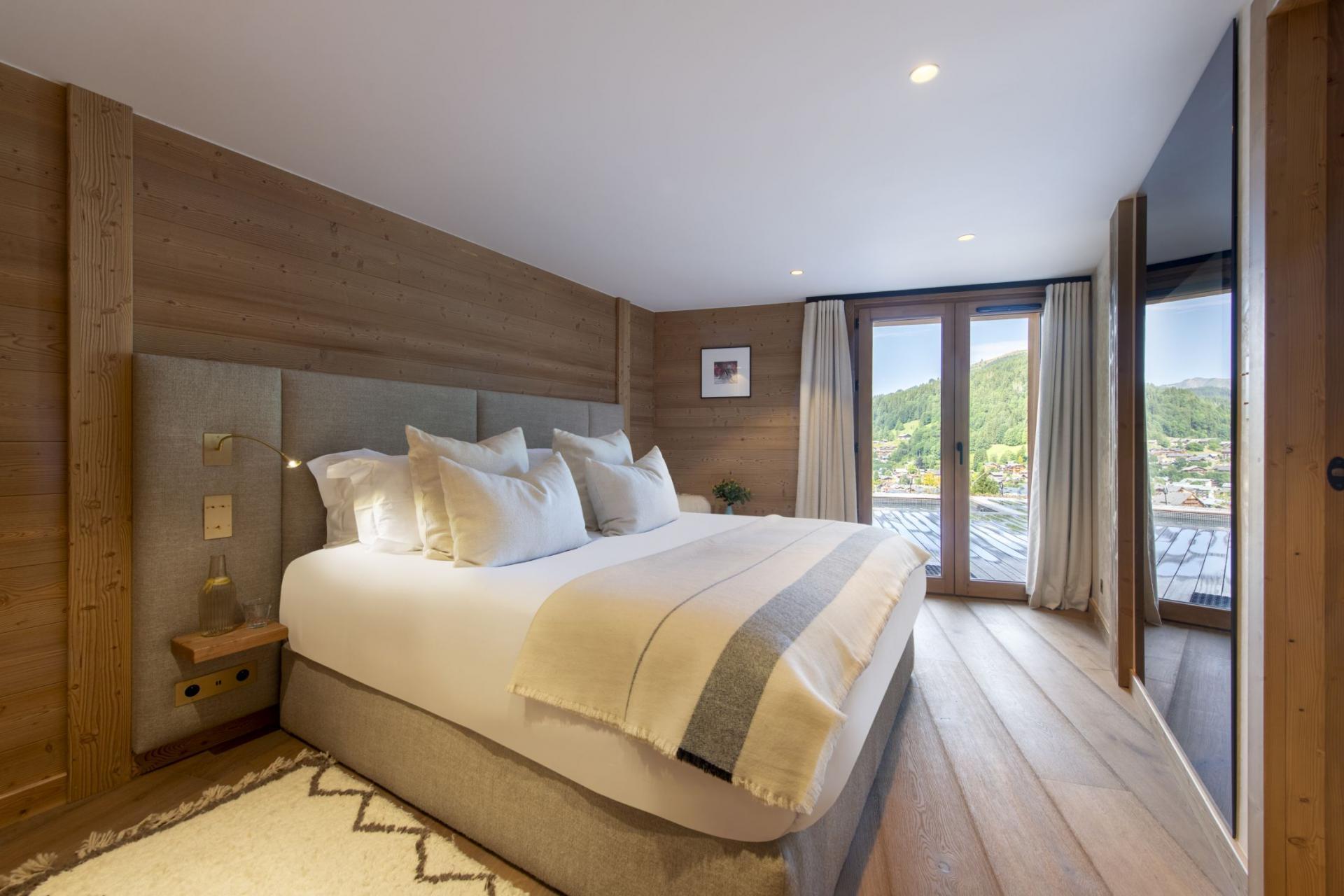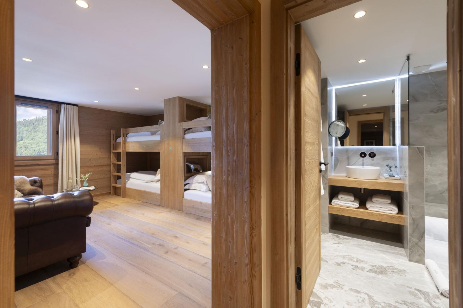 The six carefully designed bedrooms at Chalet Avalon are equally shared between two floors. The bedrooms consist of four double rooms and two children's bunk rooms, all of which maintain the contemporary alpine style found throughout the property. All four double bedrooms are en-suite and, if needed, can also be arranged into twin rooms to host different groups. The master bedroom oozes class and comfort, with large windows and high vaulted ceilings, where you will wake up to stunning summer views each morning. Additionally, the two double bedrooms on the lower ground floor offer access to the terrace with hot tub, for an enhanced summer stay.