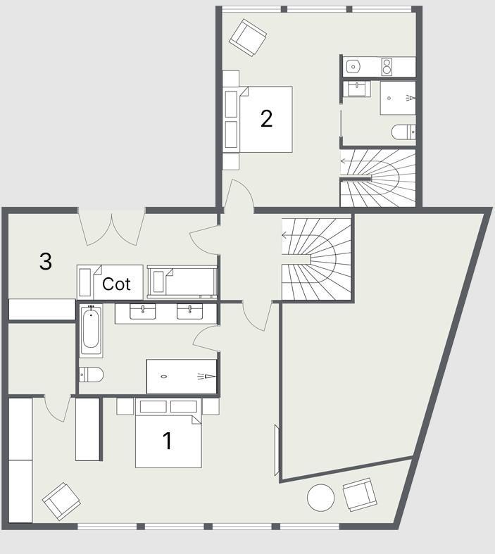 *Please Note: Bedroom 3 does not have any bath, shower, or WC facilities. Guests staying in this bedroom will need to use the facilities of another bedroom, or the guest WC and shower in the wellness area on the lower ground floor.