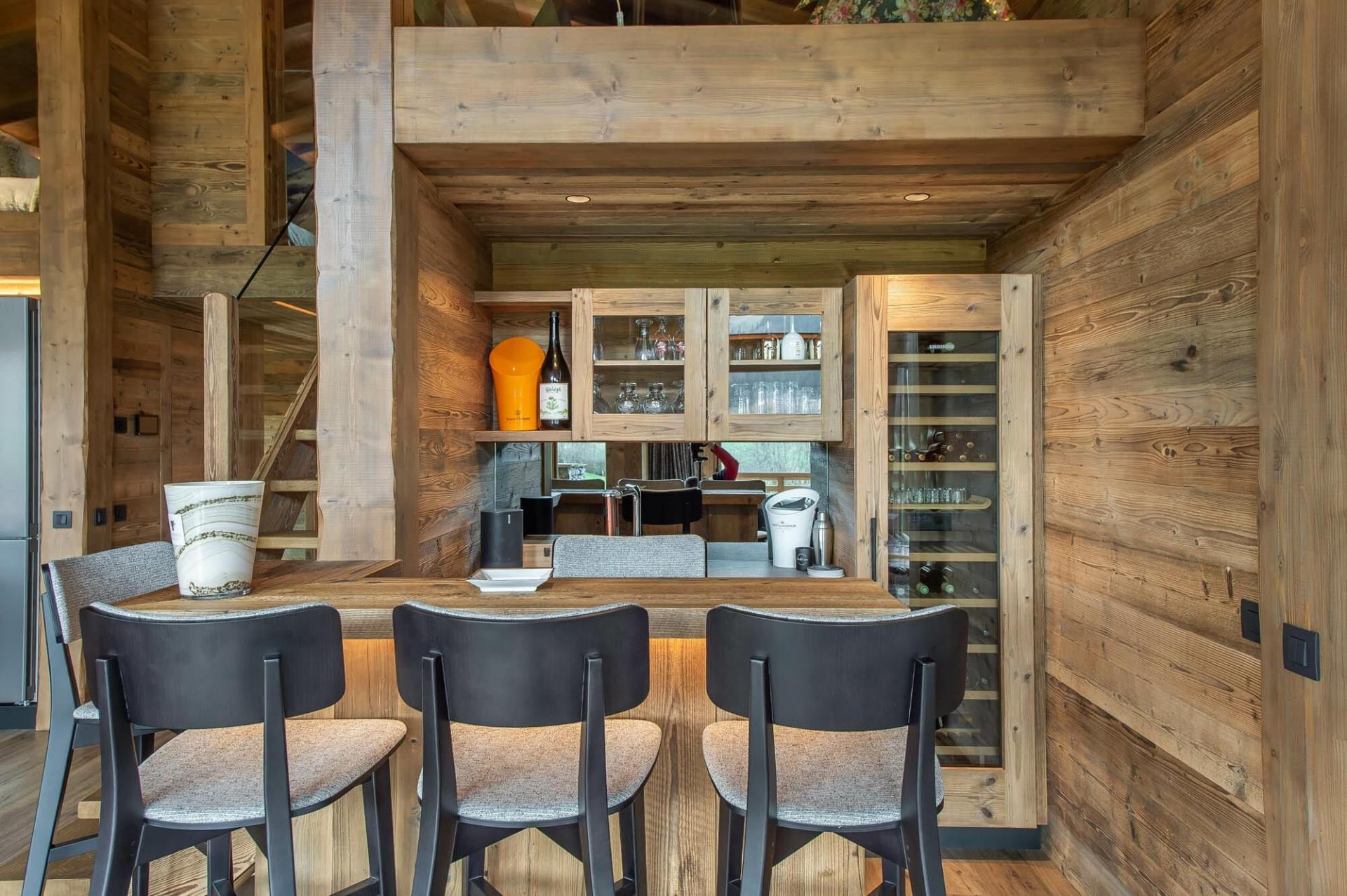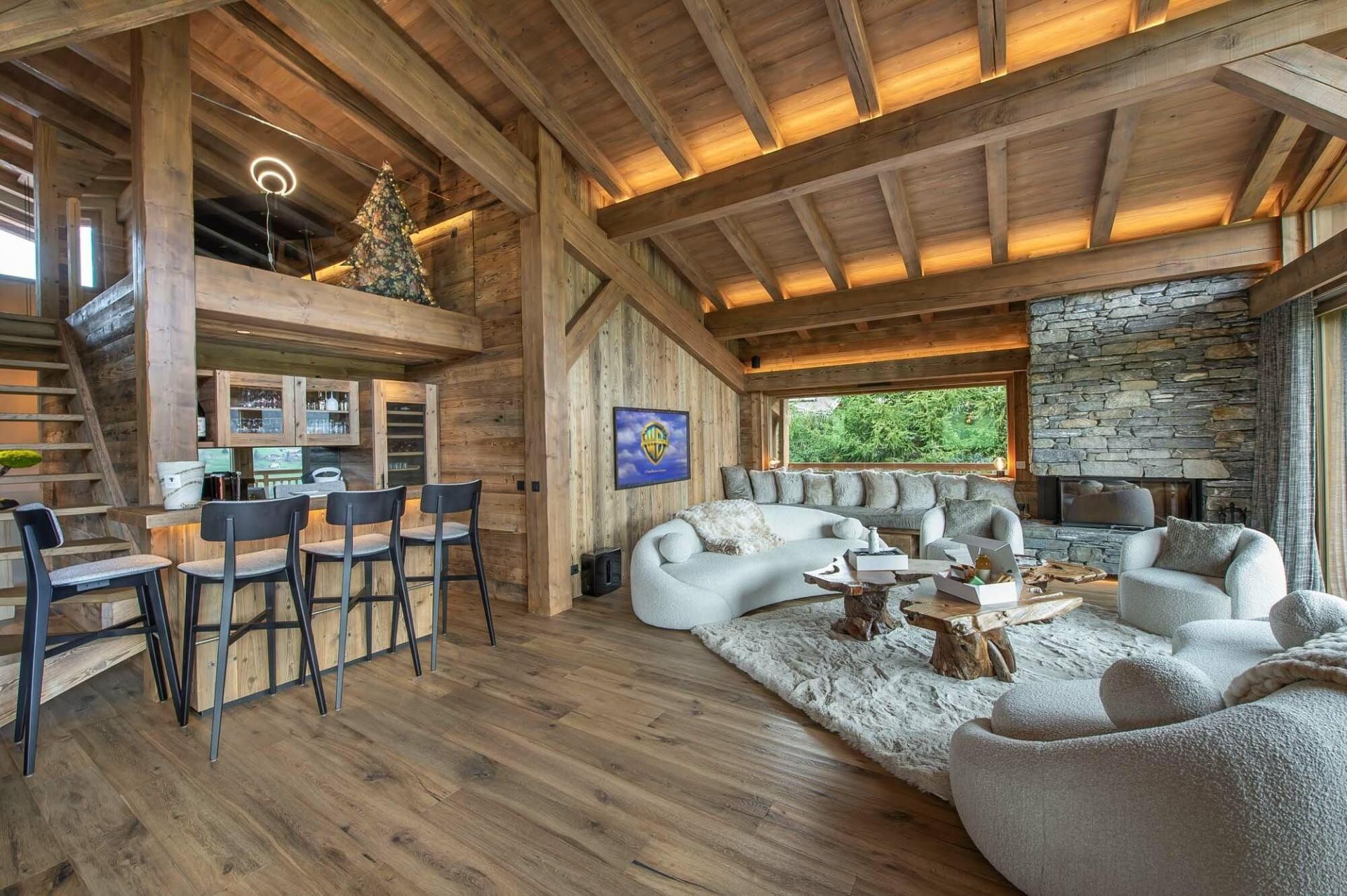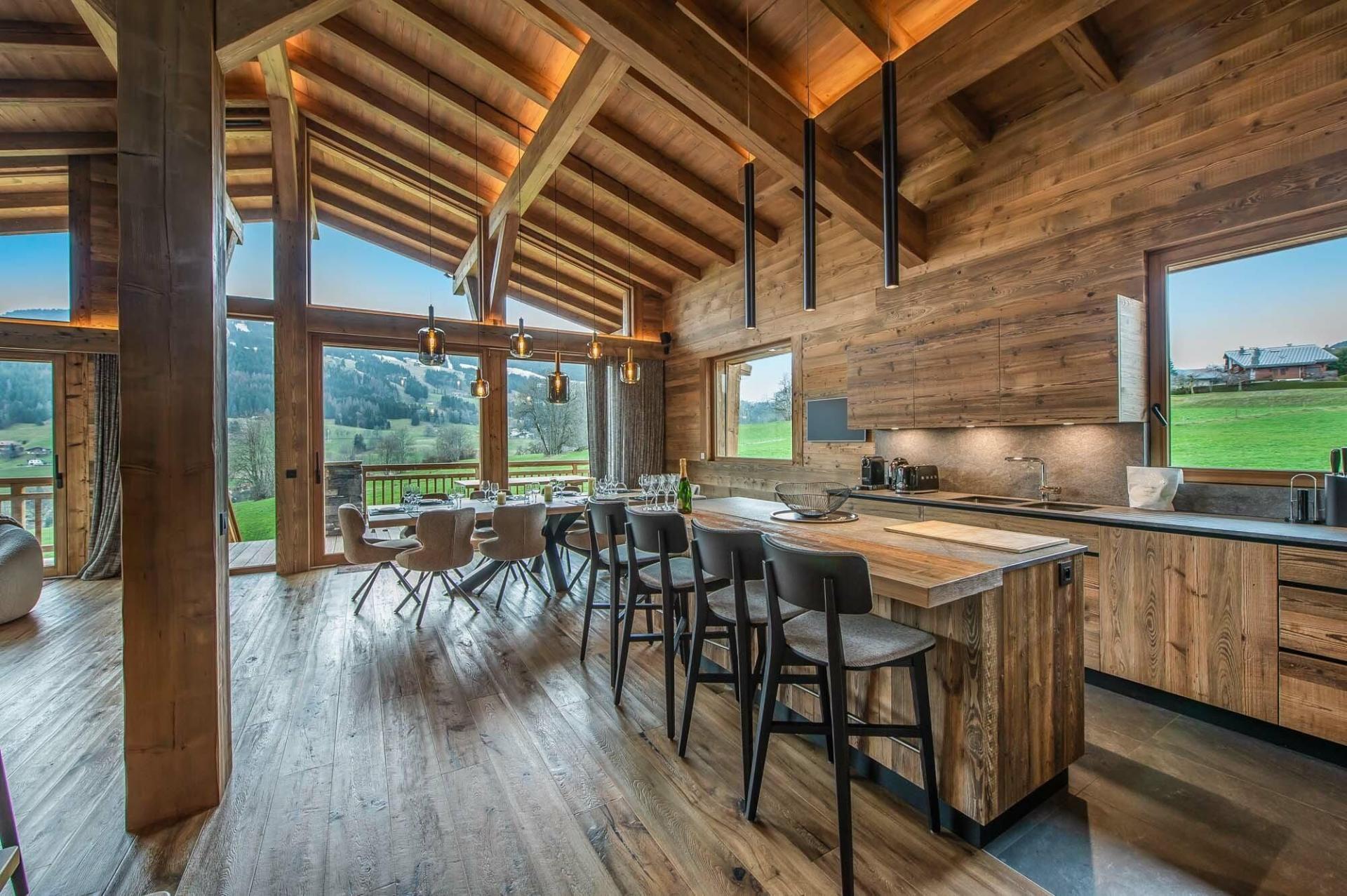 The first floor is home to the open-plan living areas. Perfectly designed with high vaulted ceilings and floor-to-ceiling windows, guests are immediately welcomed with the scenic summer views ahead. Ample seating next to the stone fireplace offers guests the ideal spot to relax and admire the wonderful views. Later in the evening, guests can move across to the dining table and tuck into each hearty homemade meal together. To complete this space, the fully equipped kitchen is perfectly accompanied by a breakfast bar, as well as a separate bar area, so the family chef can enjoy a few casual drinks whilst cooking.