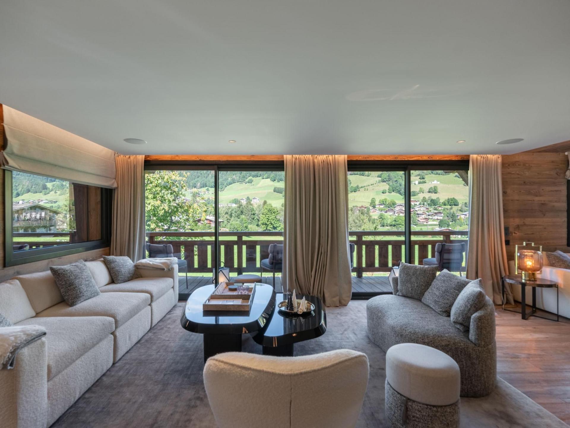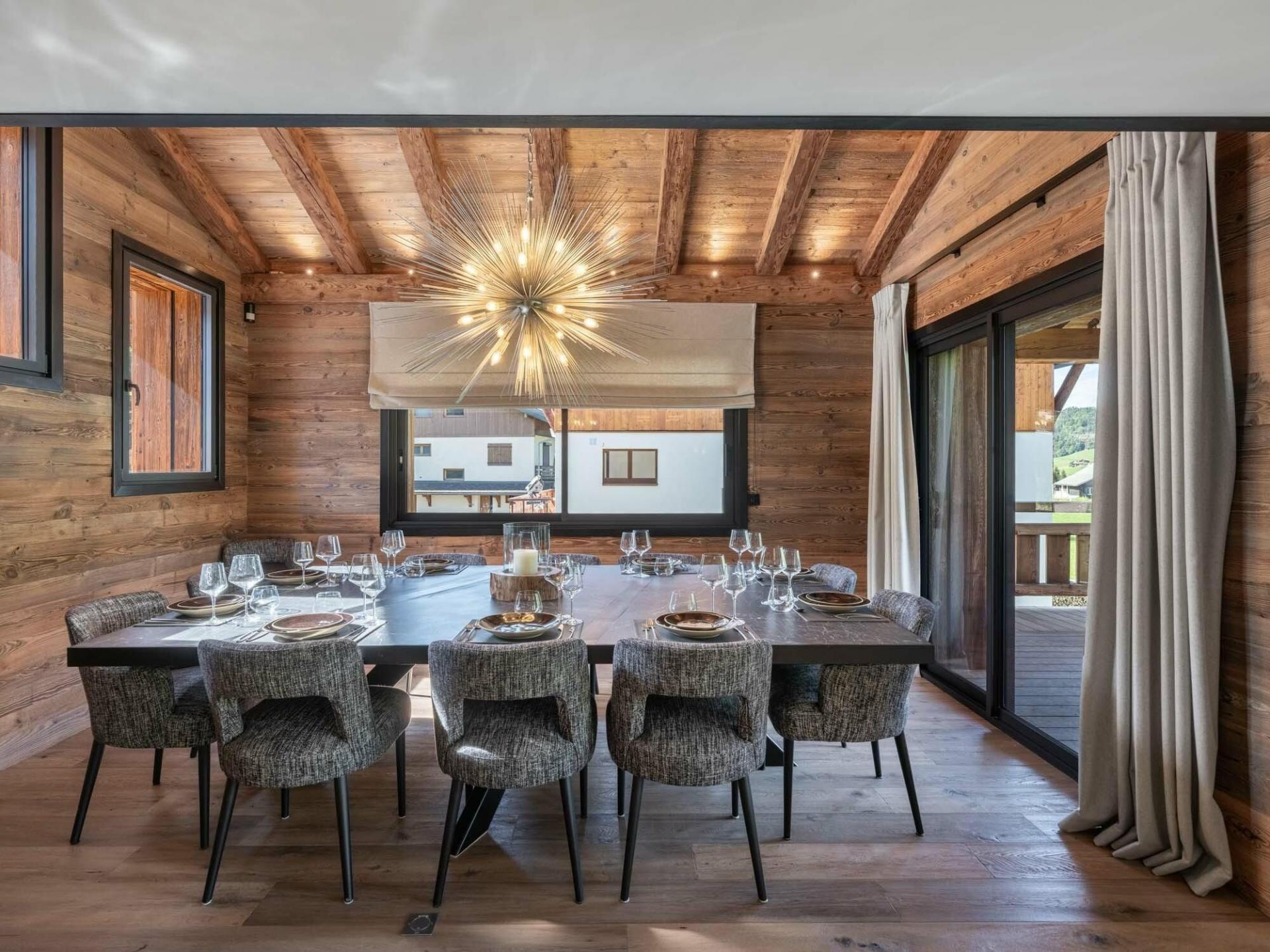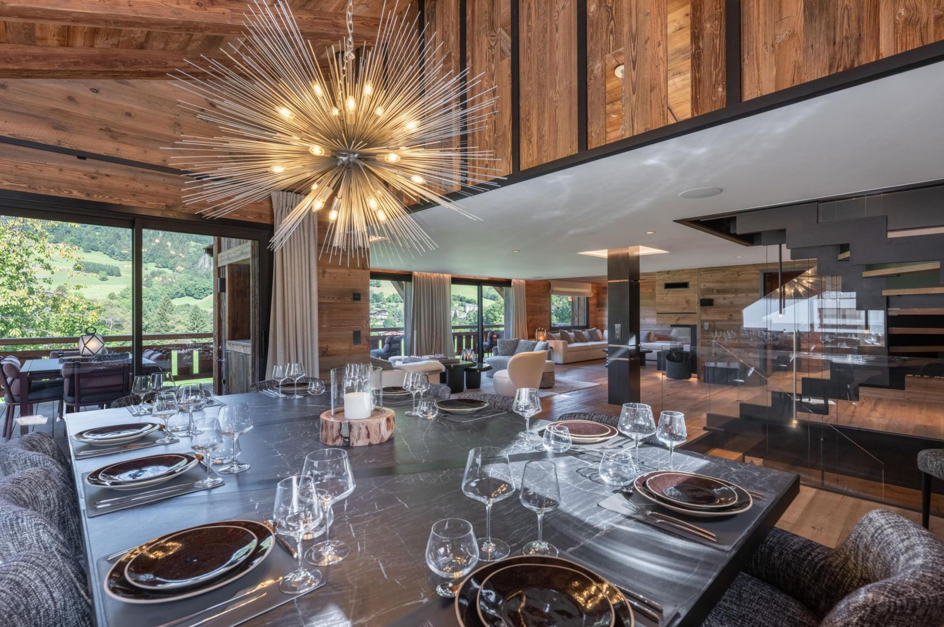 The interior is lined with noble materials, blending warm lighting with crisp paint to exude a contemporary wood cabin feel to the build. An incredibly spacious open-plan design joins the common spaces into one living area, with the idea of convivial living in mind. Large windows frame the surrounding valley, exposing the luscious greenery and rolling mountains for guests to enjoy. These windows open up to a balcony area for guests to enjoy a more intimate view of the valley, take a drink of your choice out and enjoy the summer breeze. Comfortable sofas invite guests to rest their legs after a long day out in Megève during summer. Take a moment to enjoy a beverage as you await your appointed chef to create a gourmet masterpiece in the fully fitted kitchen for a wonderful family meal on the large dining table. A breakfast table in the kitchen area allows for additional dining arrangements, and a wine fridge is sure to keep your favourite vintages cool during your stay.
