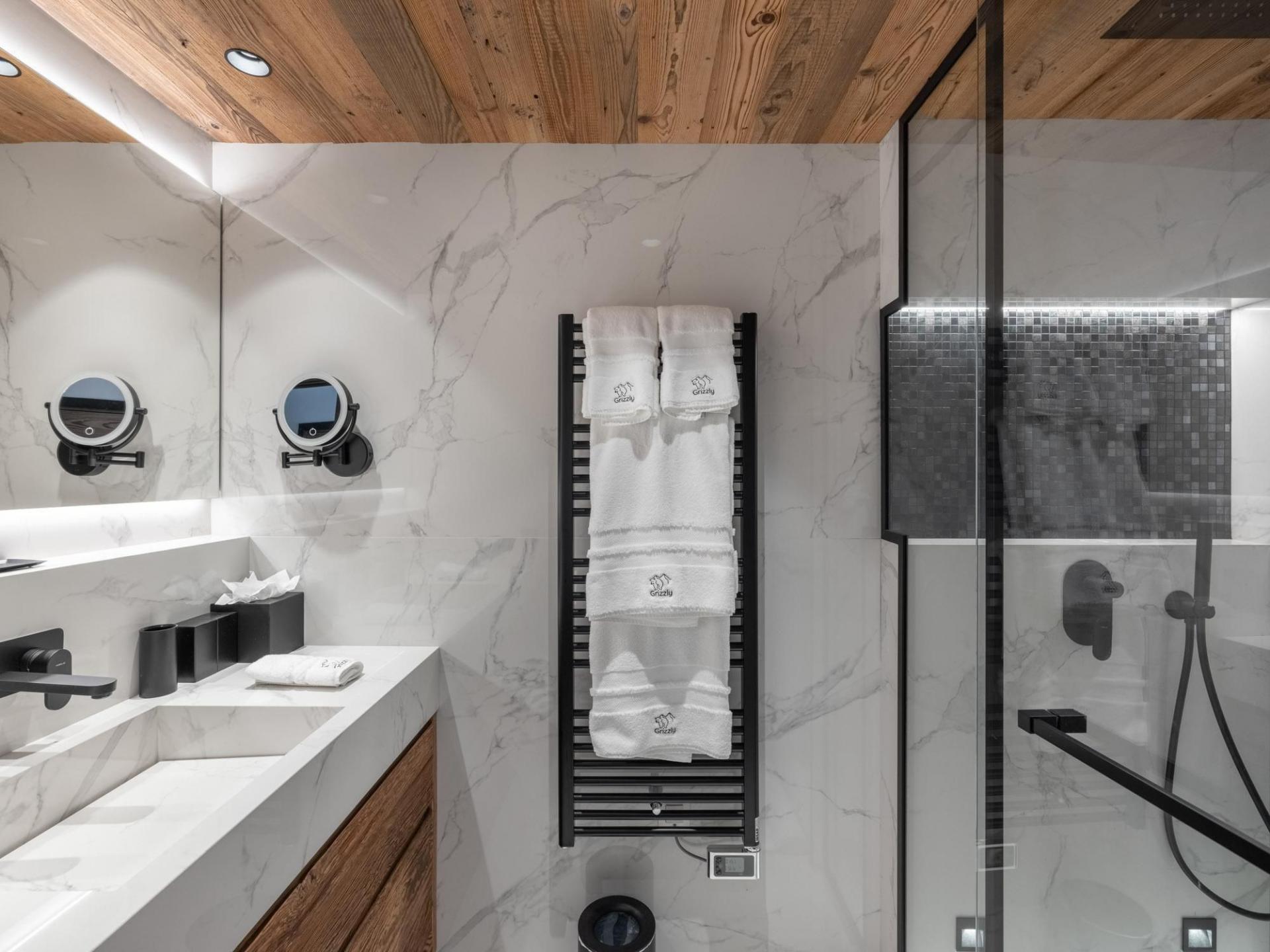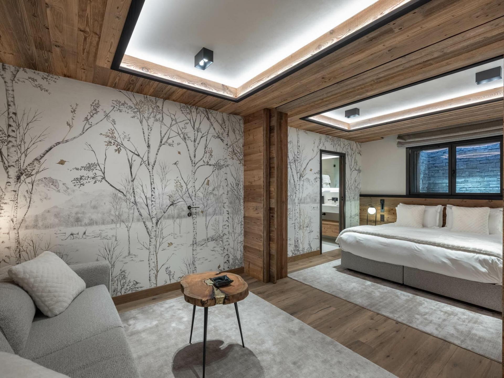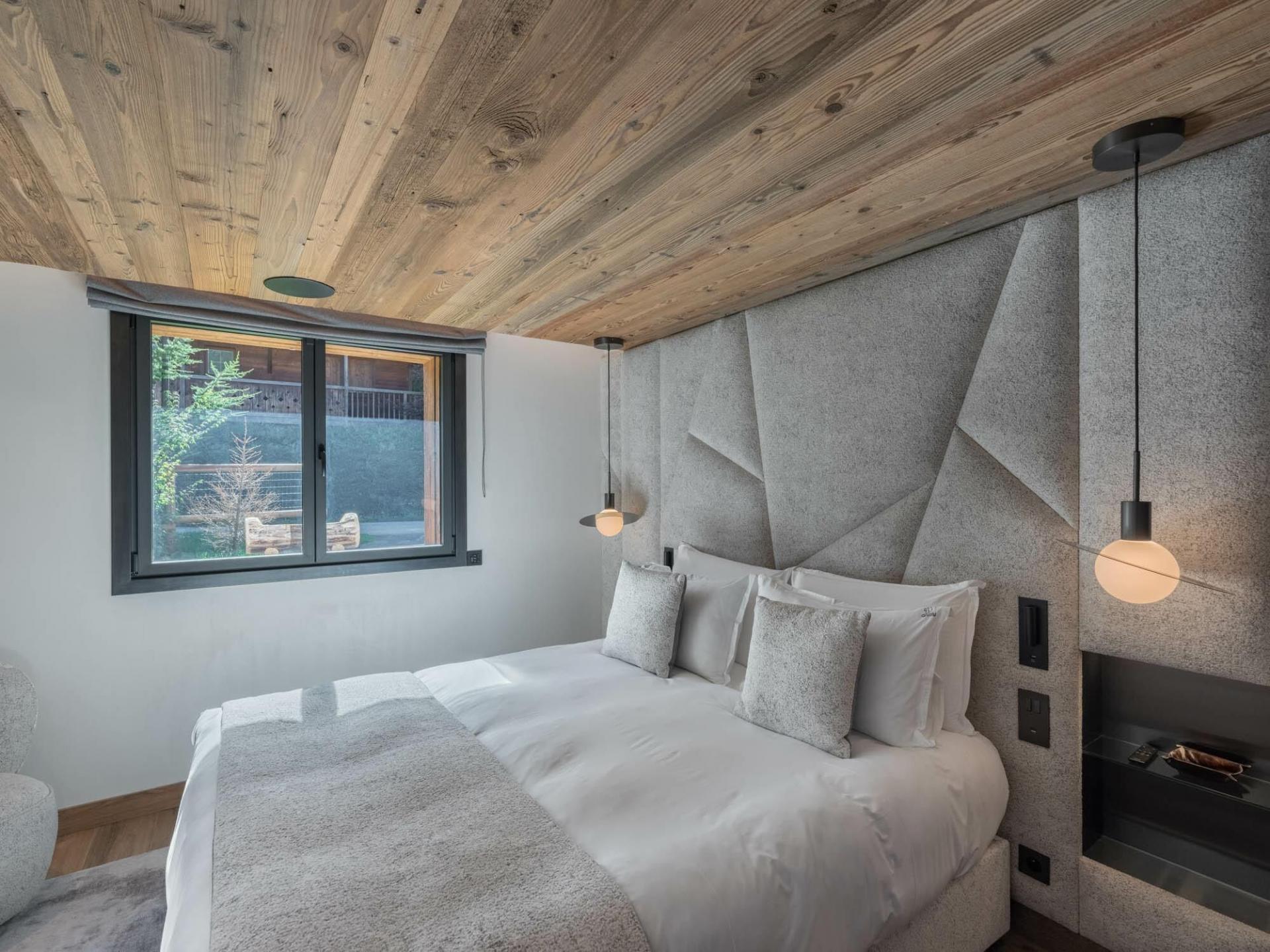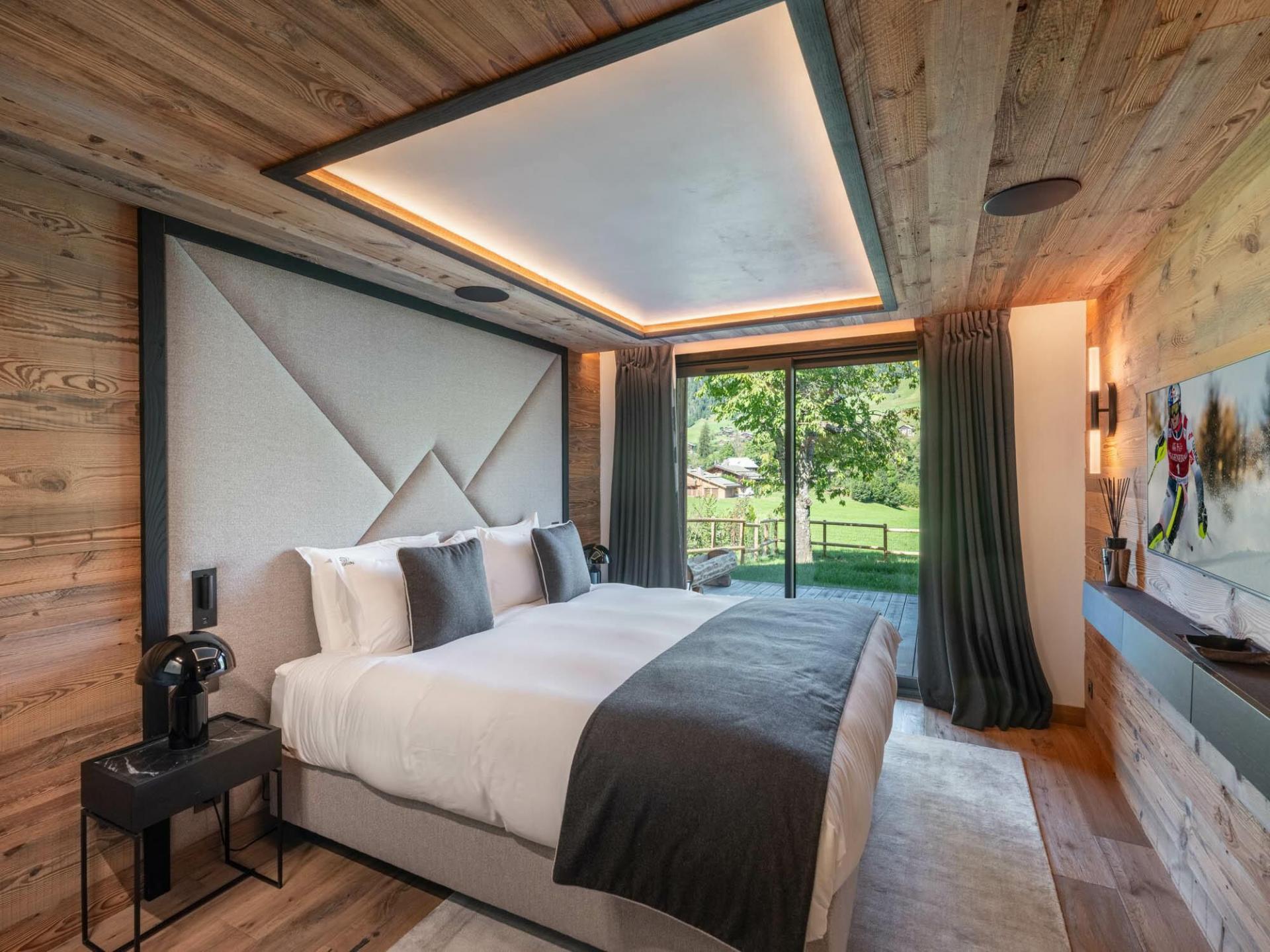 Chalet Grizzly can accommodate up to 12 guests, spread across 6 en-suite bedrooms. The bedrooms conform to a similar design as the rest of the chalet, blending wood and modern accents with soft lighting. Select rooms also feature vaulted ceilings to add a spacious feel. Plush bedding ensures guests receive the rest they deserve in order to tackle any obstacles their mountainous adventures may bring. Many of the bedrooms also provide access to the garden or a private balcony to elevate their summer stay in Megève.