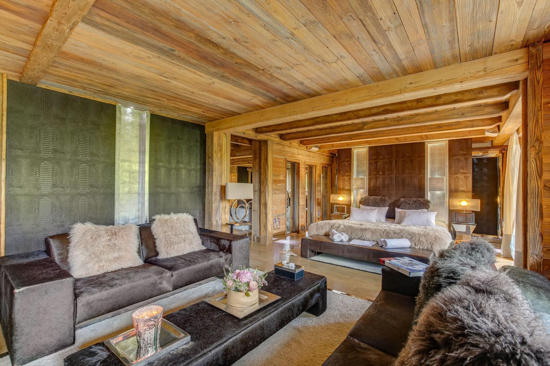 In total, Chalet La Maille can host up to 10 adults and 5 children across five double bedrooms and a children's dormitory. Each room continues the property's stylish alpine design, with wooden cladding and deluxe furnishings creating a luxurious, homely feel. For comfort and convenience, all rooms are partnered with modern en-suite amenities, in addition to outdoor access via terraces and balconies. The master bedroom exudes elegance, the stand out of all rooms in the chalet, featuring a private lounge and an accompanying fireplace for chillier evenings. The children's dormitory is also perfect for family groups, found on the chalet's first floor.