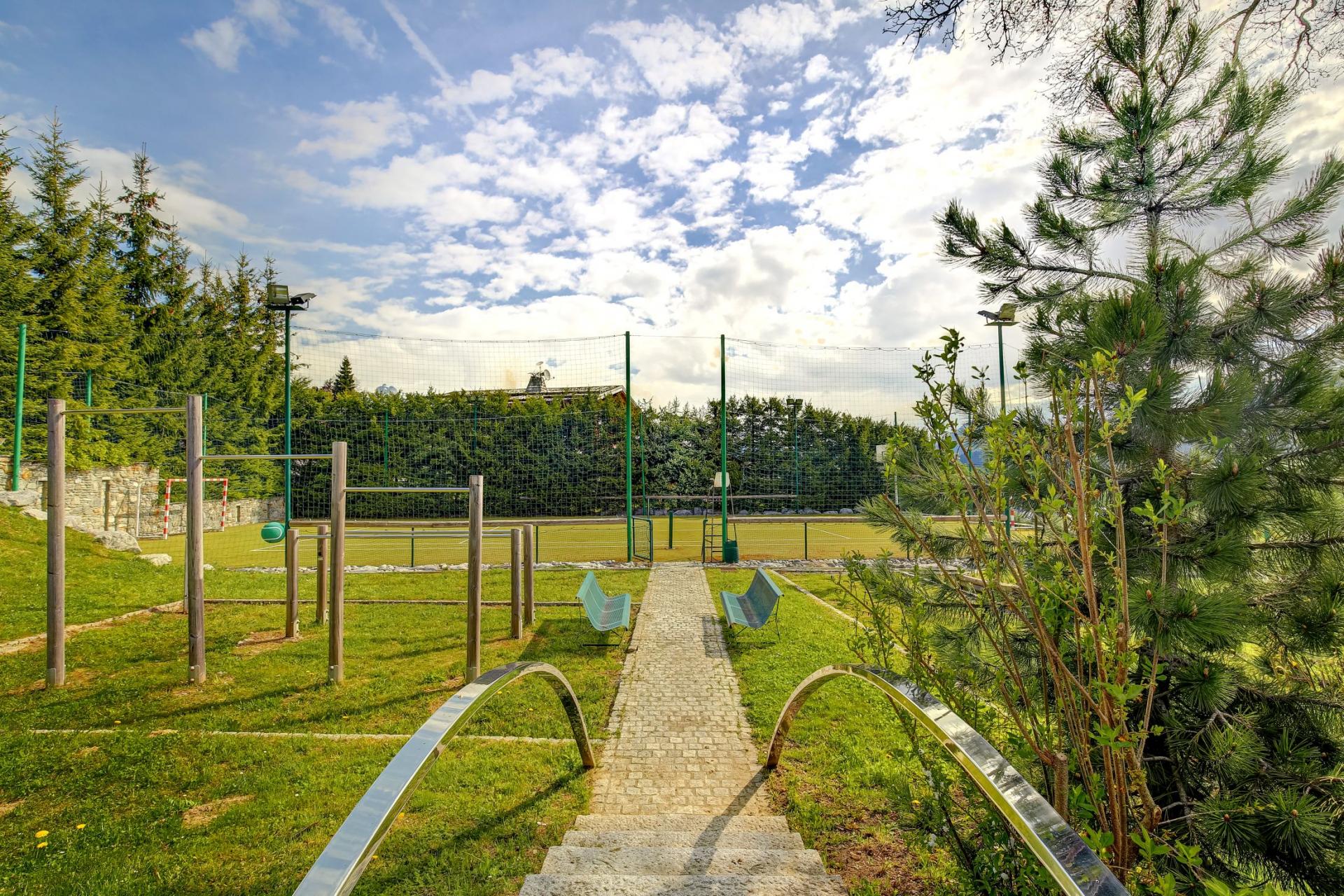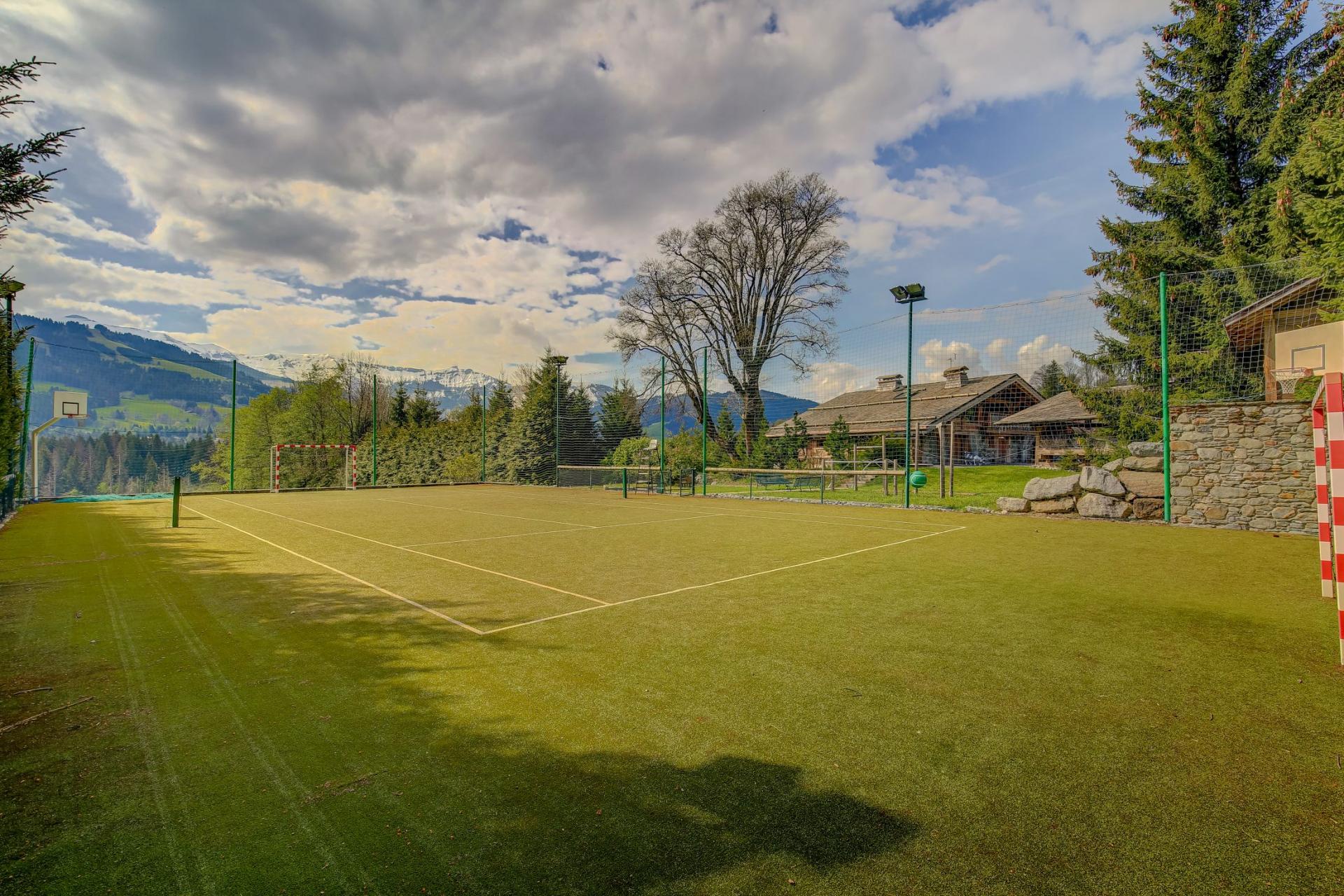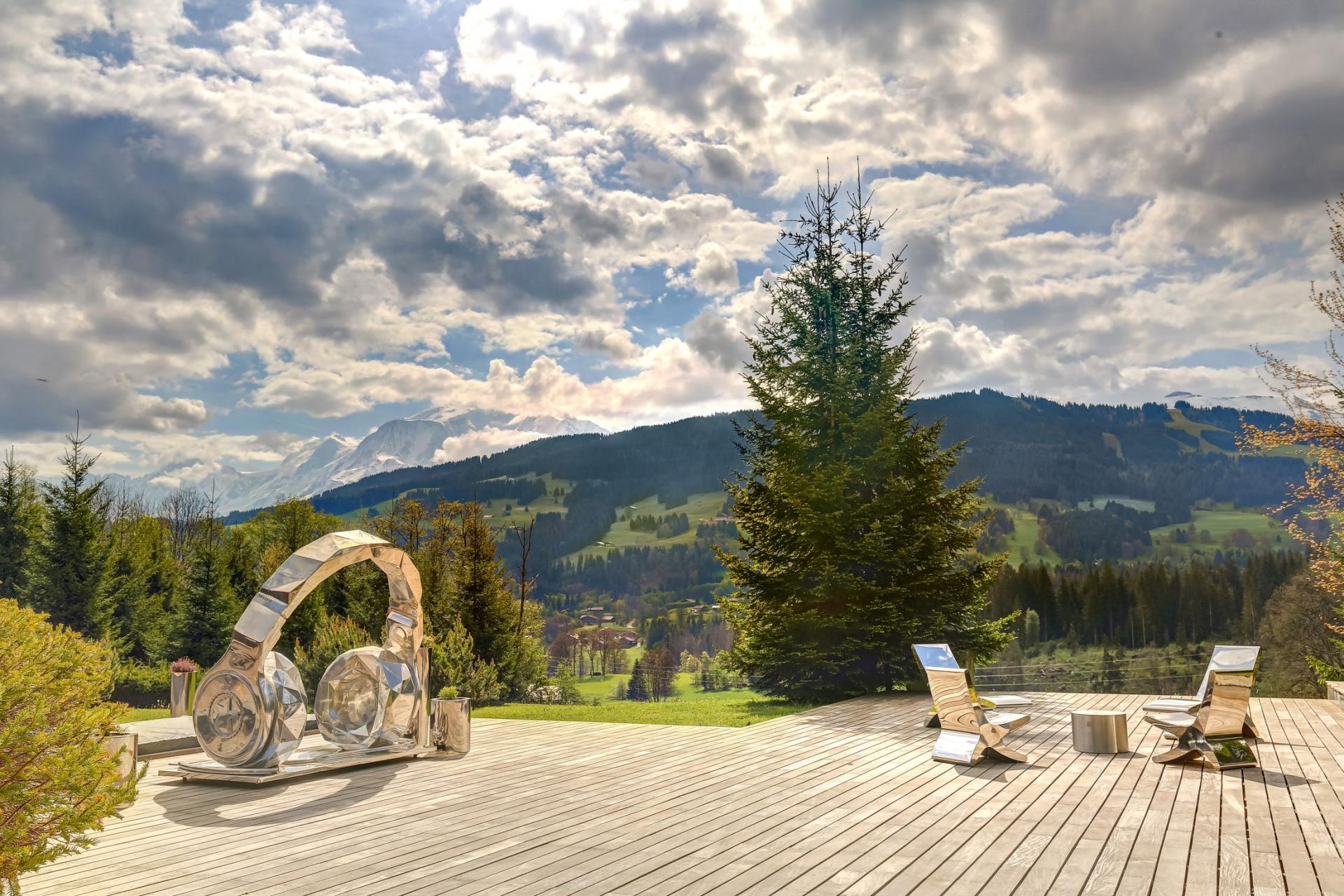 Chalet La Maille's exceptional outdoor areas invite long afternoons to be spent with the whole group. Featuring numerous balconies and an expansive terrace, there's also a beautiful conversation pit where guests can cuddle up and gaze upon breathtaking Mont Blanc views over a glass from the chalet's wine cellar. In the day, roaming luscious gardens spread over an acre of land, for exploration and soaking in the mountain scenery. For families, a multi-activity sports court provides ample outdoor entertainment for everyone to get involved in tennis, basketball and handball competitions. A number of statues also help to bring a unique feel to the property's outdoor spaces.