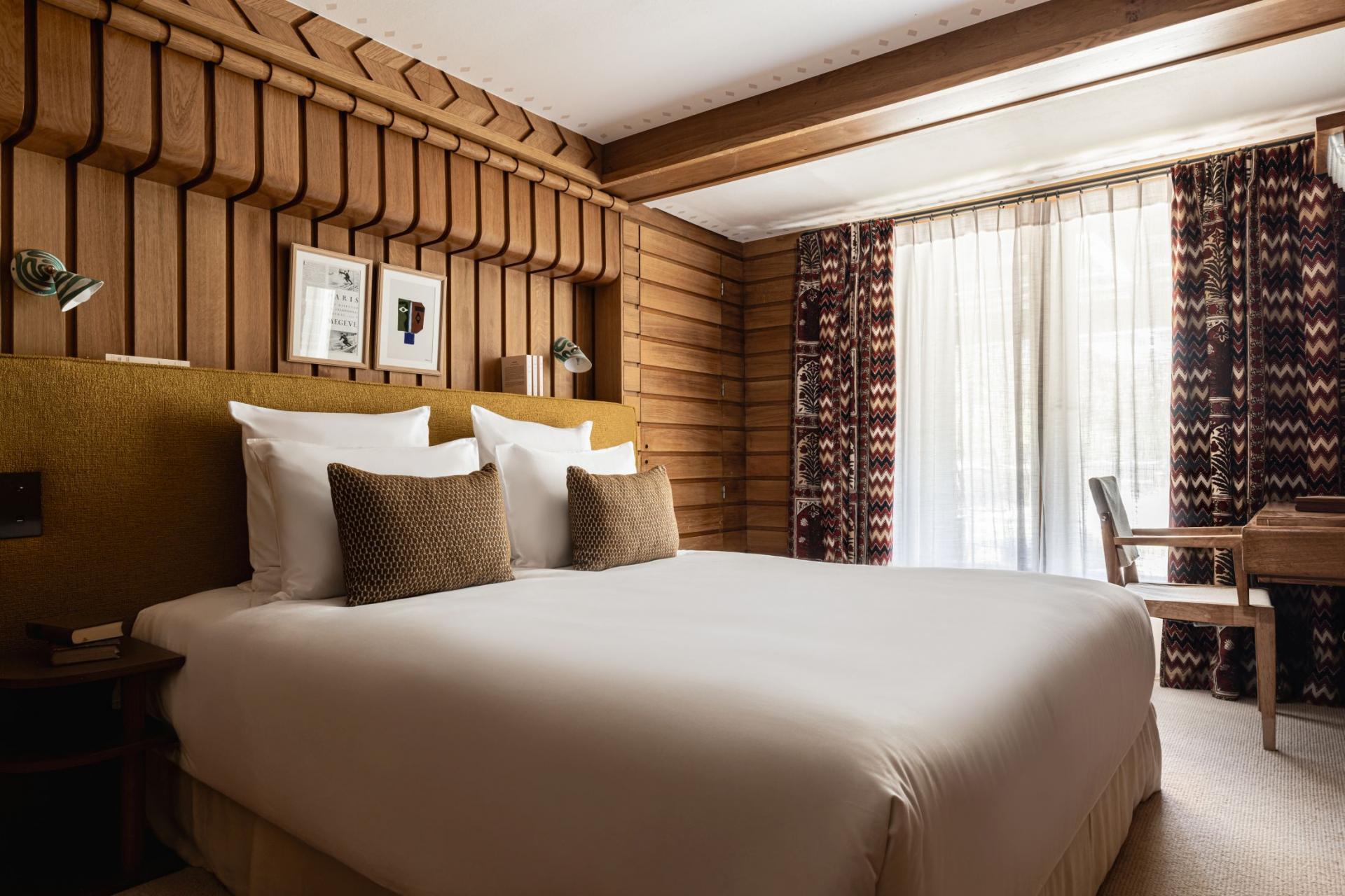 The capacious 650m² Chalet Le Sarto bears a striking design, with an art deco theme that draws its inspiration from Megève architect Henry Jacques Le Même. Vibrant pops of colour and homely furnishings mix with bespoke wood interiors and characterful decor. The main lounge is an inviting spot to sit before the feature tiled fireplace, and leads directly through to the funky dining area and fully-equipped kitchen, which can be closed off or kept open to the dining space depending on your preferences.