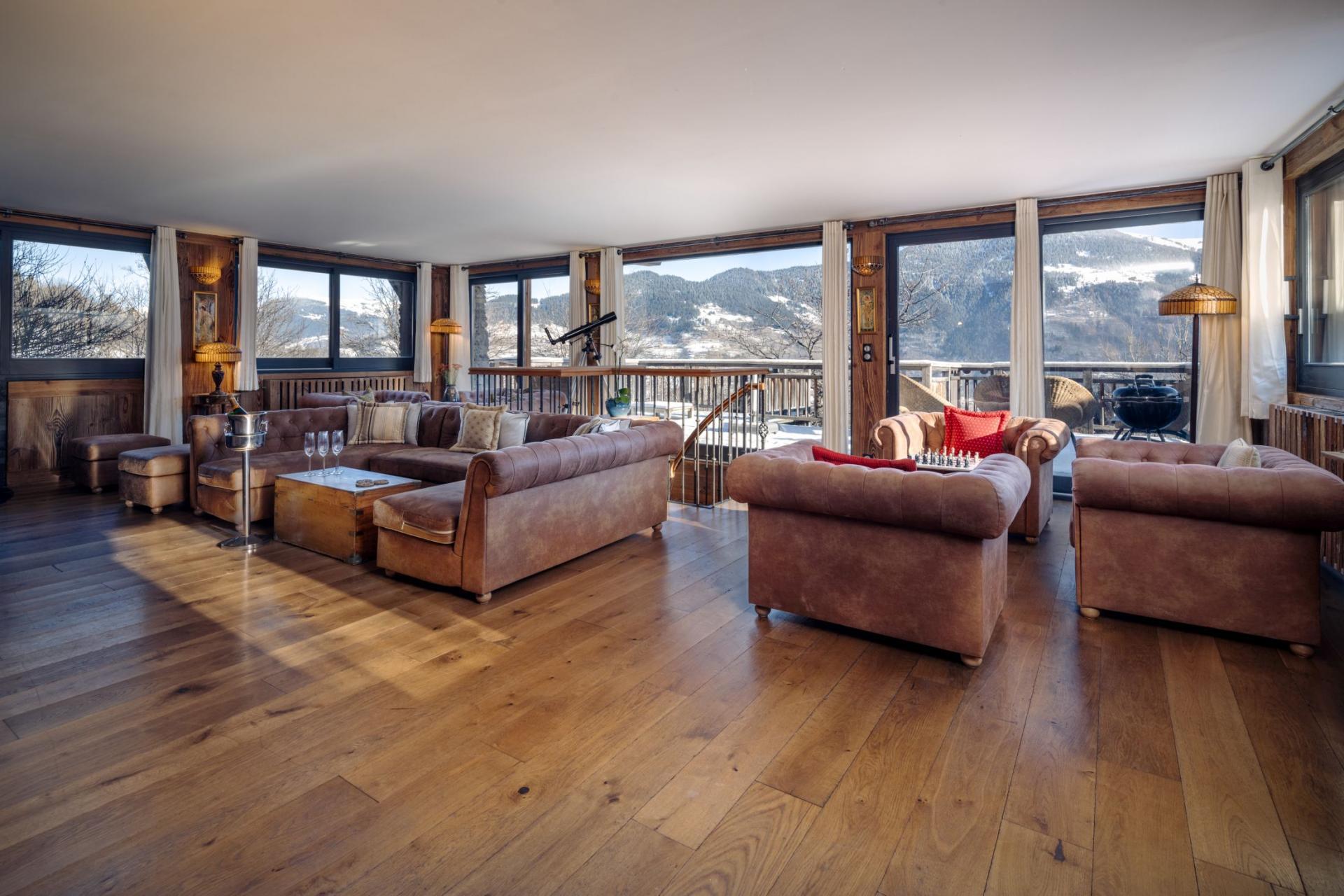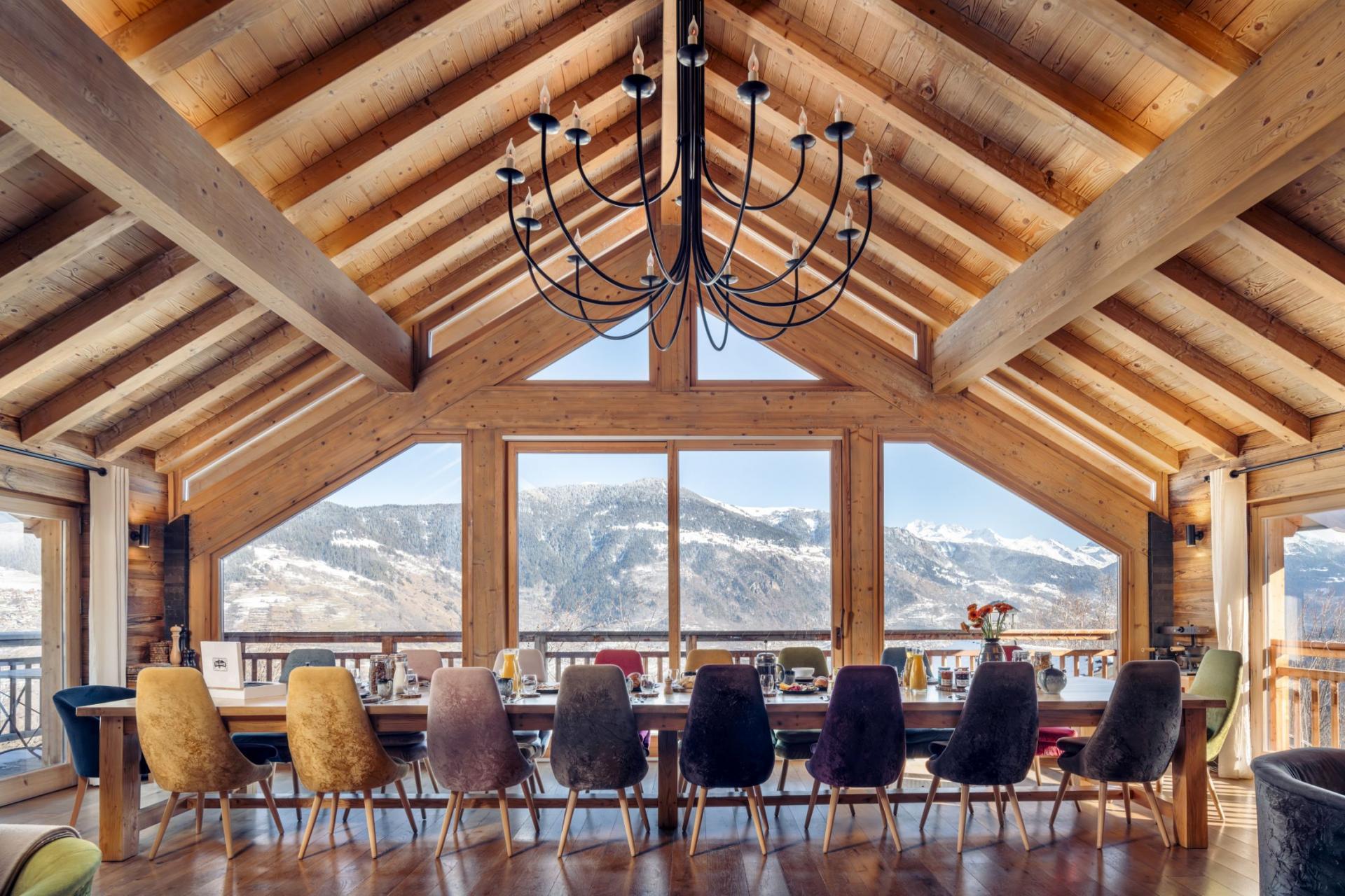 As you walk through the entrance hall, the open-plan living area continues the rustic feel with wooden interiors and beamed ceilings. Comfy armchairs partner the fireplace, with a lovely additional seating arrangement that encourages conversation. An impressive dining table brings enough seating for the entire group to get together in the evening. The dining table conveniently sits in front of the large floor to ceiling windows, allowing you to gaze over the mountains whilst tucking into each meal. The fully equipped kitchen completes the living areas and includes a roomy breakfast bar.