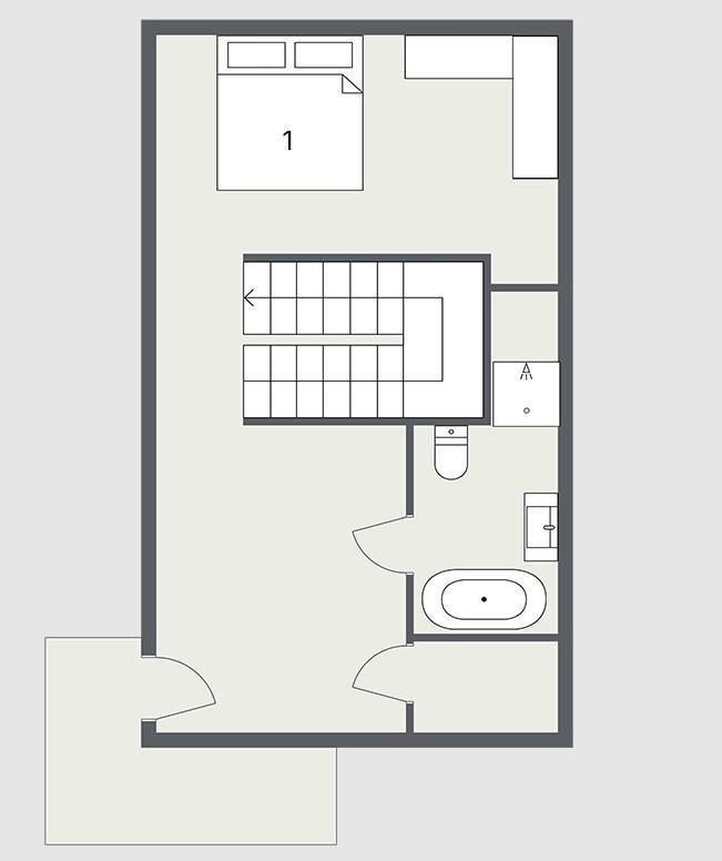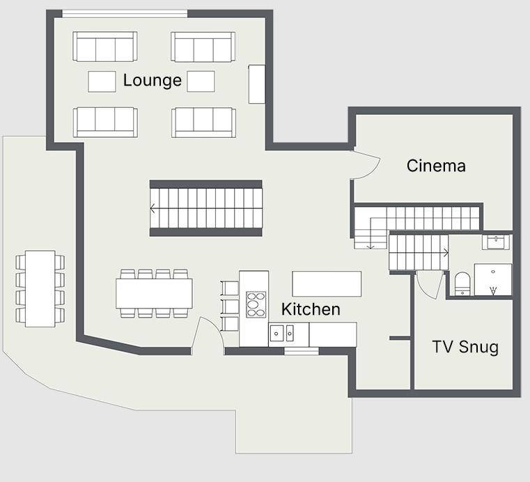 Located on the top floor of this chalet is the main living space. It is flooded with light from the large floor-to-ceiling windows that also command a beautiful view of the surrounding mountains. This space has a large seating area suitable for the whole group, featuring a beautiful fireplace. There is a fully equipped open-plan kitchen towards the rear of this area, alongside a breakfast bar and also a wonderful dining area for the whole group to dine together.