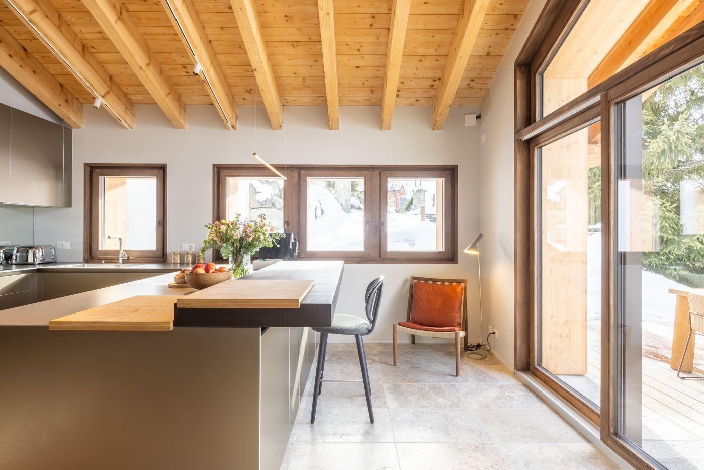 At Chalet Les Attelas, the living room oozes traditional alpine style with wooden cladding and stone walls. Cosy sofas are conveniently placed around the large TV, so guests can enjoy some casual viewing at the end of each day. Additional seating is also included for when guests want to socialise in the evenings. In the dining area, high ceilings and large windows help to elevate mealtimes throughout the week. The kitchen is situated next to the dining table and has a modern finish. The perfect place for guests to rustle up their hearty homemade meals.
