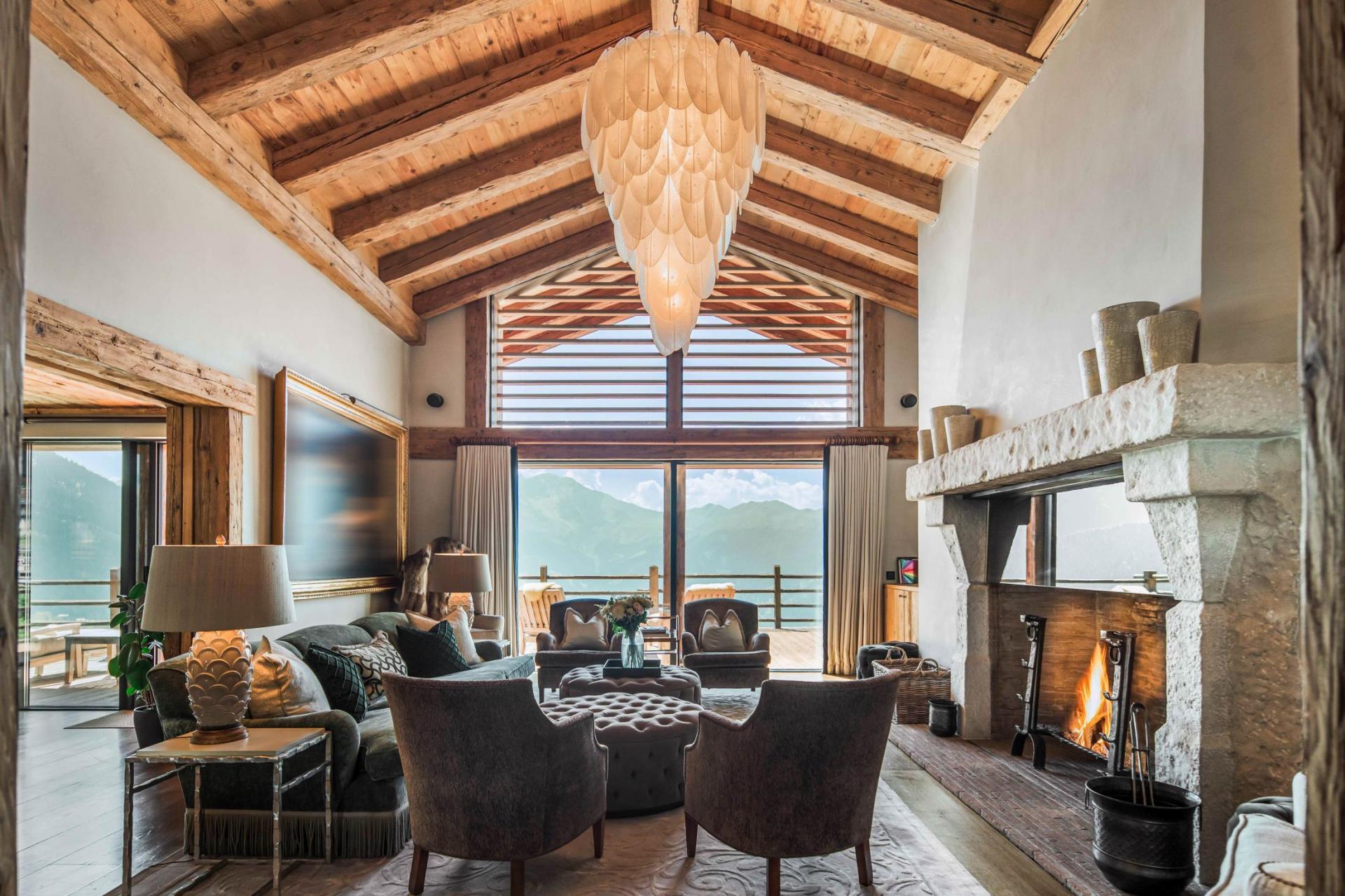 The primary living spaces of Chalet Norte occupy the first floor. The lounge is truly impressive, with a double-height vaulted ceiling, cascading petal chandelier, cavernous open fireplace and lavish furnishings that create a distinguished space of exquisite design. The adjacent dining room can be open or closed off from the lounge and offers a stately setting to indulge in fabulous gourmet cooking. Expansive floor-to-ceiling windows in the lounge and dining space frame the picturesque mountain scenery, unbeatable views afforded by the chalet's exclusive location. A spacious south-facing balcony can be accessed from these two rooms, allowing you to bathe in the glorious sunshine of the long summer days.