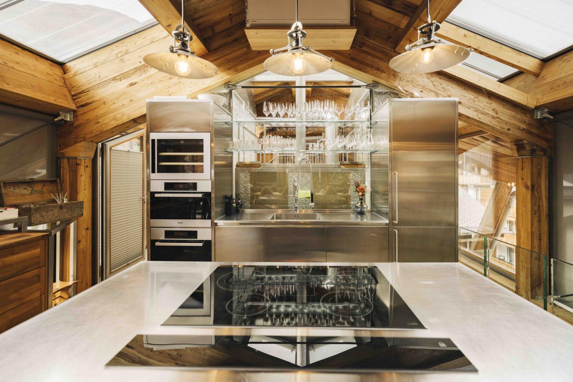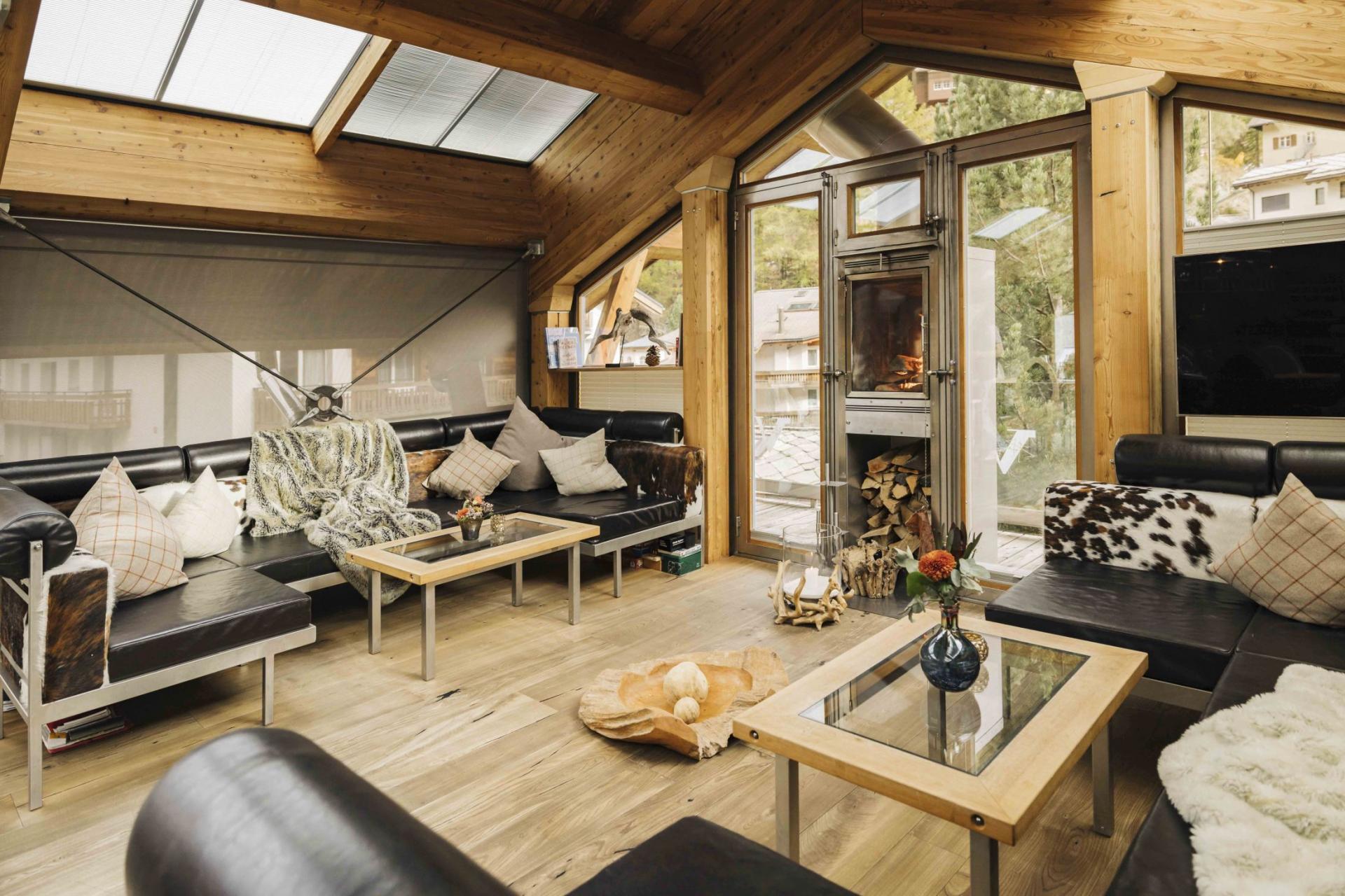 The roof structure has open gables, and provides an open living, dining and kitchen space, with the fireplace giving the place a cosy atmosphere. At the opposite end of the fireplace, Heinz Julen has devised and built a spectacular whirlpool - a fascinatingly small feat of engineering, that is probably unique among its kind worldwide. The pool accommodates up to 6 people. At the press of a button the roof opens and the pool is hydraulically lifted above the roof! The view from above the chalet is truly breathtaking, making the experience unlike any other you can find in Zermatt.