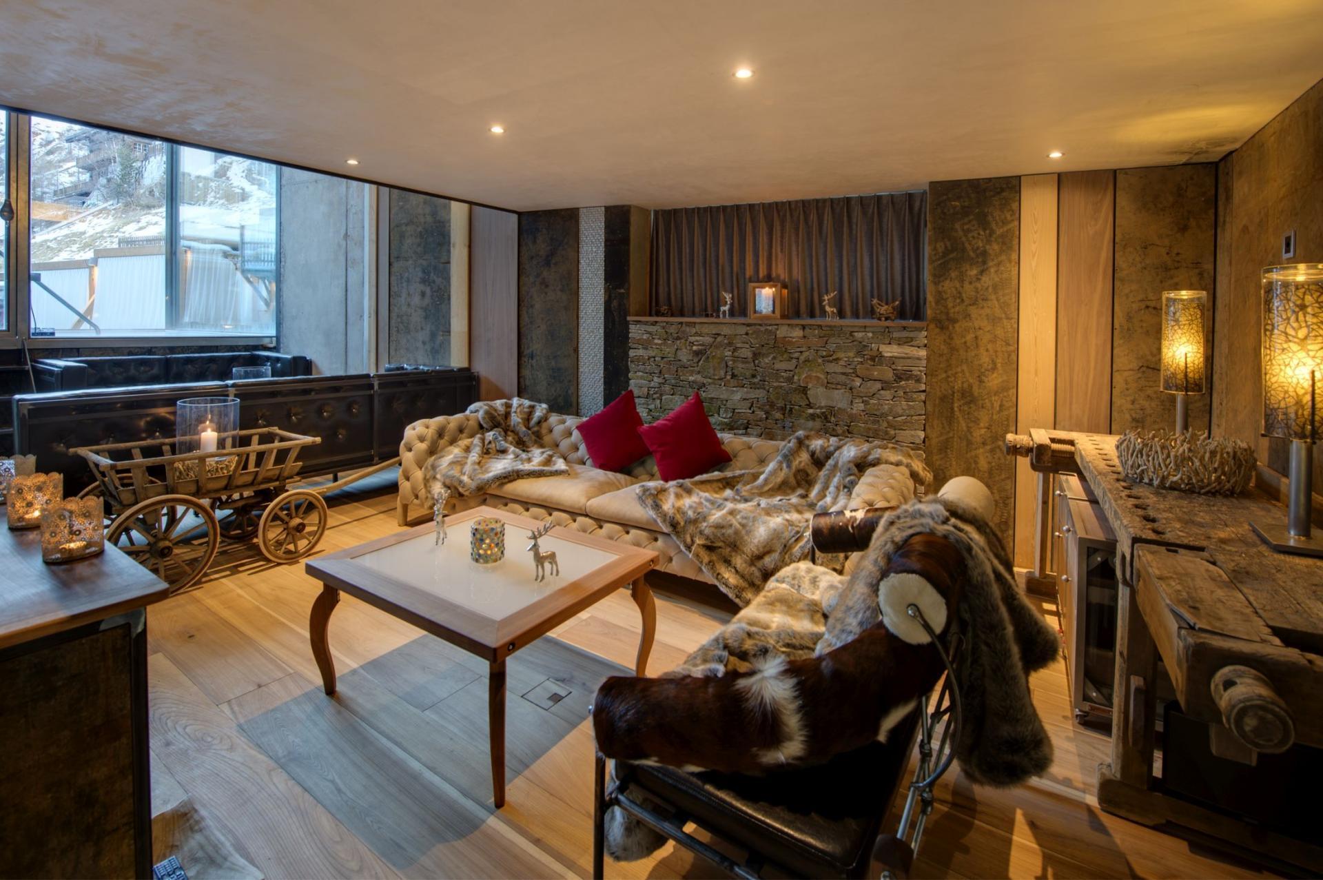 The Backstage Loft is a one-off masterpiece, fusing the historic wooden architecture of the ancient adjoining chalet with the contemporary flair of the main chalet. To complement the overall design of the building, Heinz Julen has custom-made every fitting and piece of furniture in his own design studio and workshop located in the village. This property truly is a jewel in Zermatt's luxury chalet offerings.