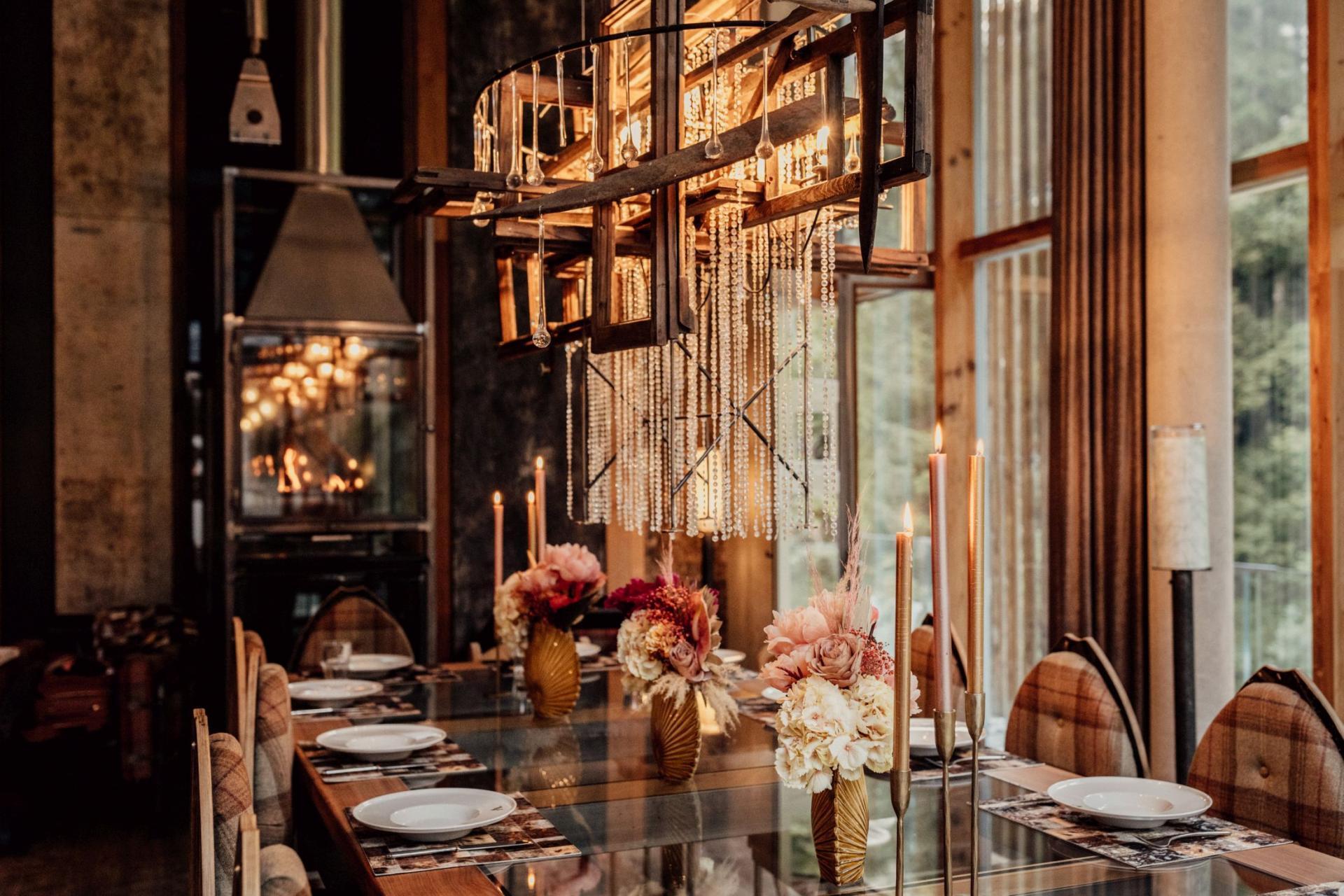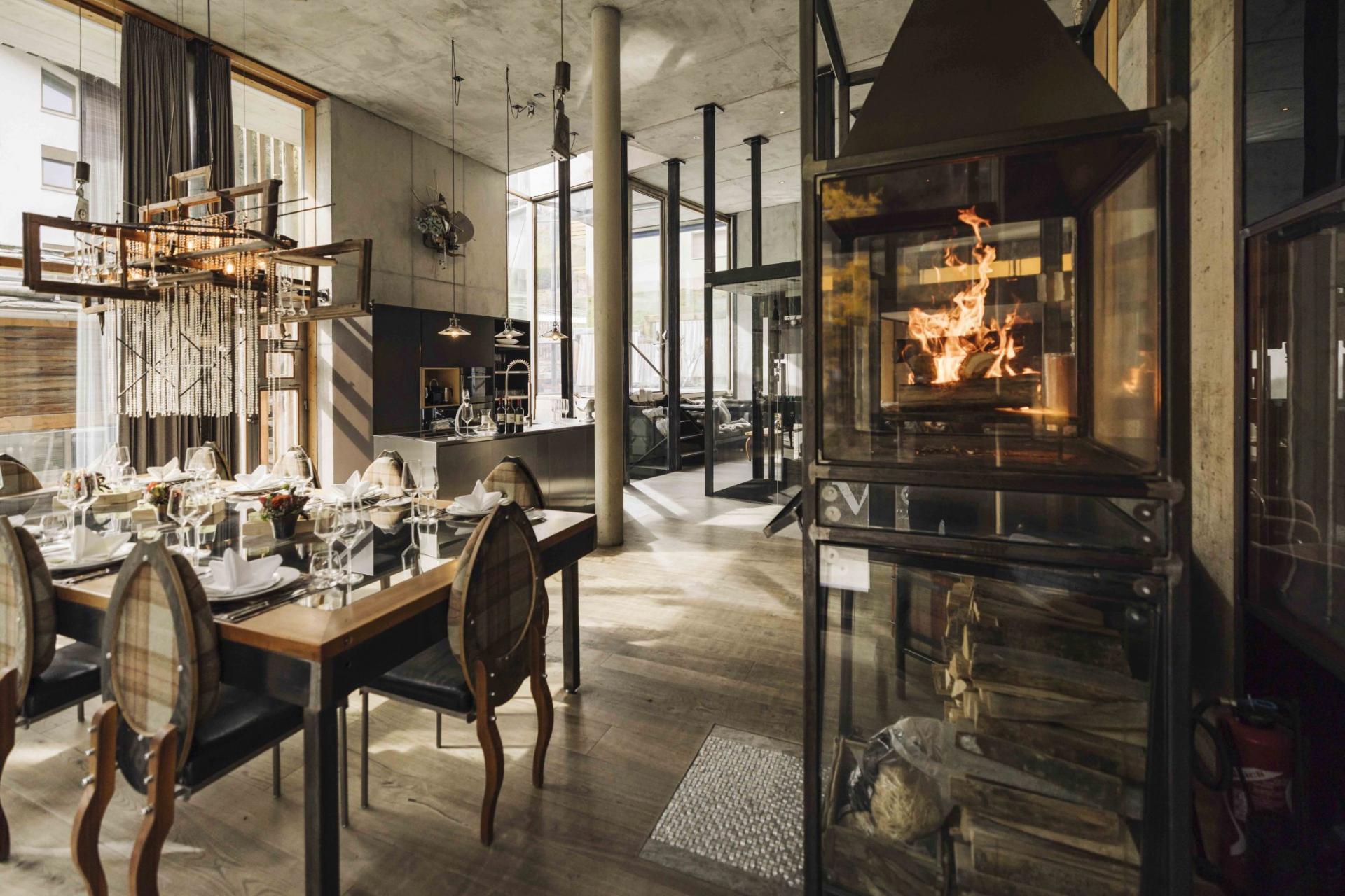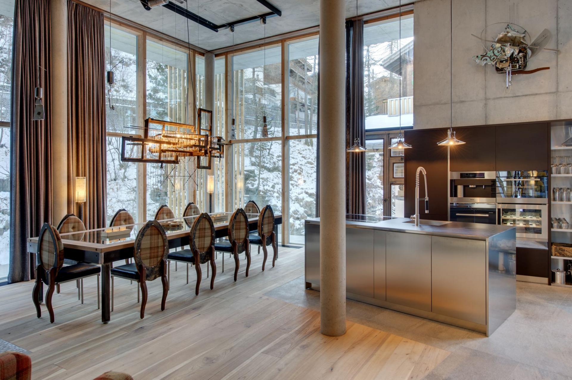 Central to the Backstage Loft is its large, airy, and bright open-plan kitchen, living, and dining area in the main structure, which features floor-to-ceiling windows that enhance the unique architectural style and charm of the chalet and open wood fire.