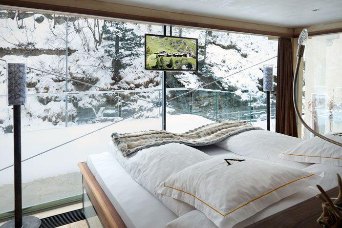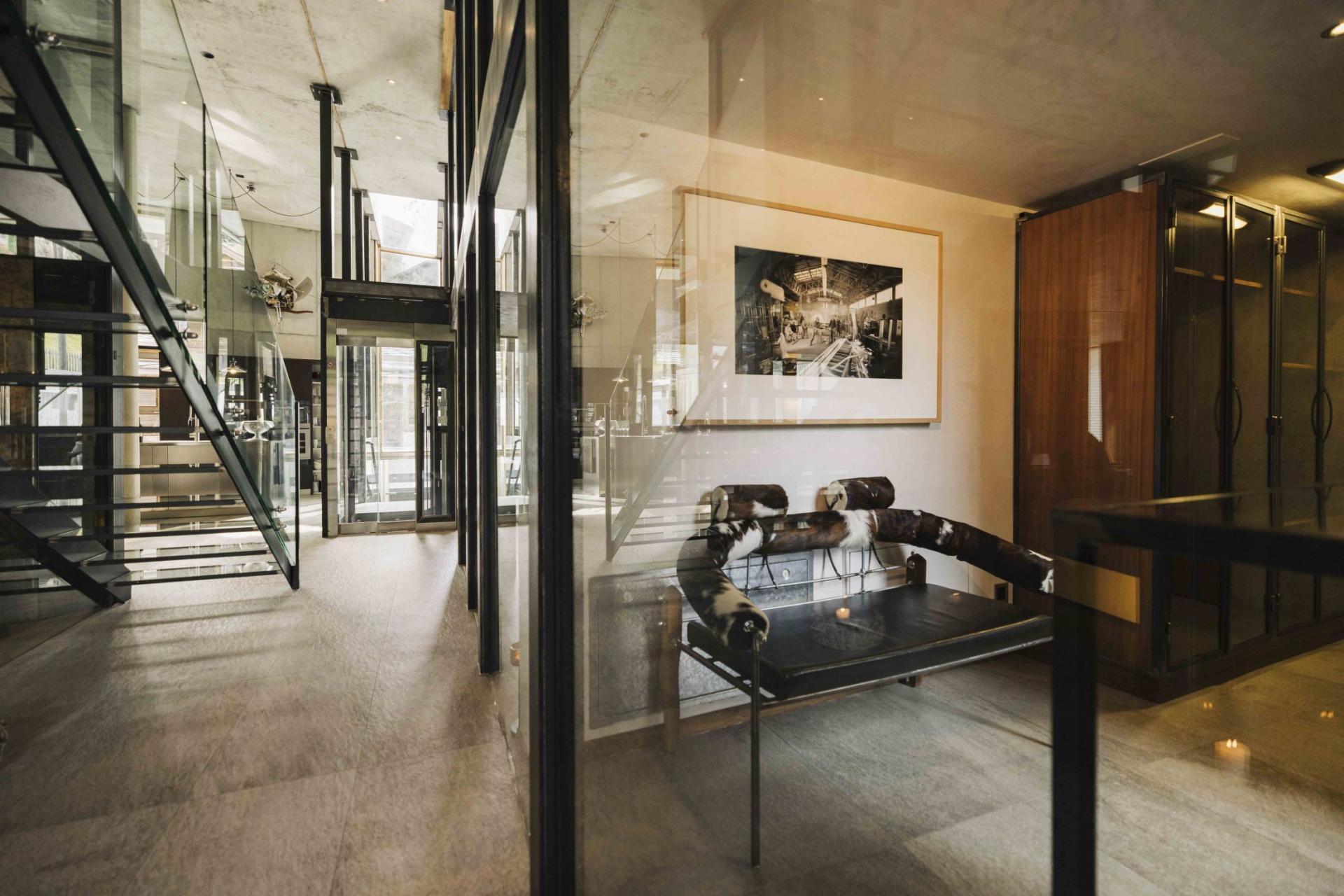 From this central area, guests access four of the spacious en-suite bedrooms. The fifth master bedroom is located in the adjoining glass-encased converted 700-year-old chalet, the design of which show-cases its original wooden beams.